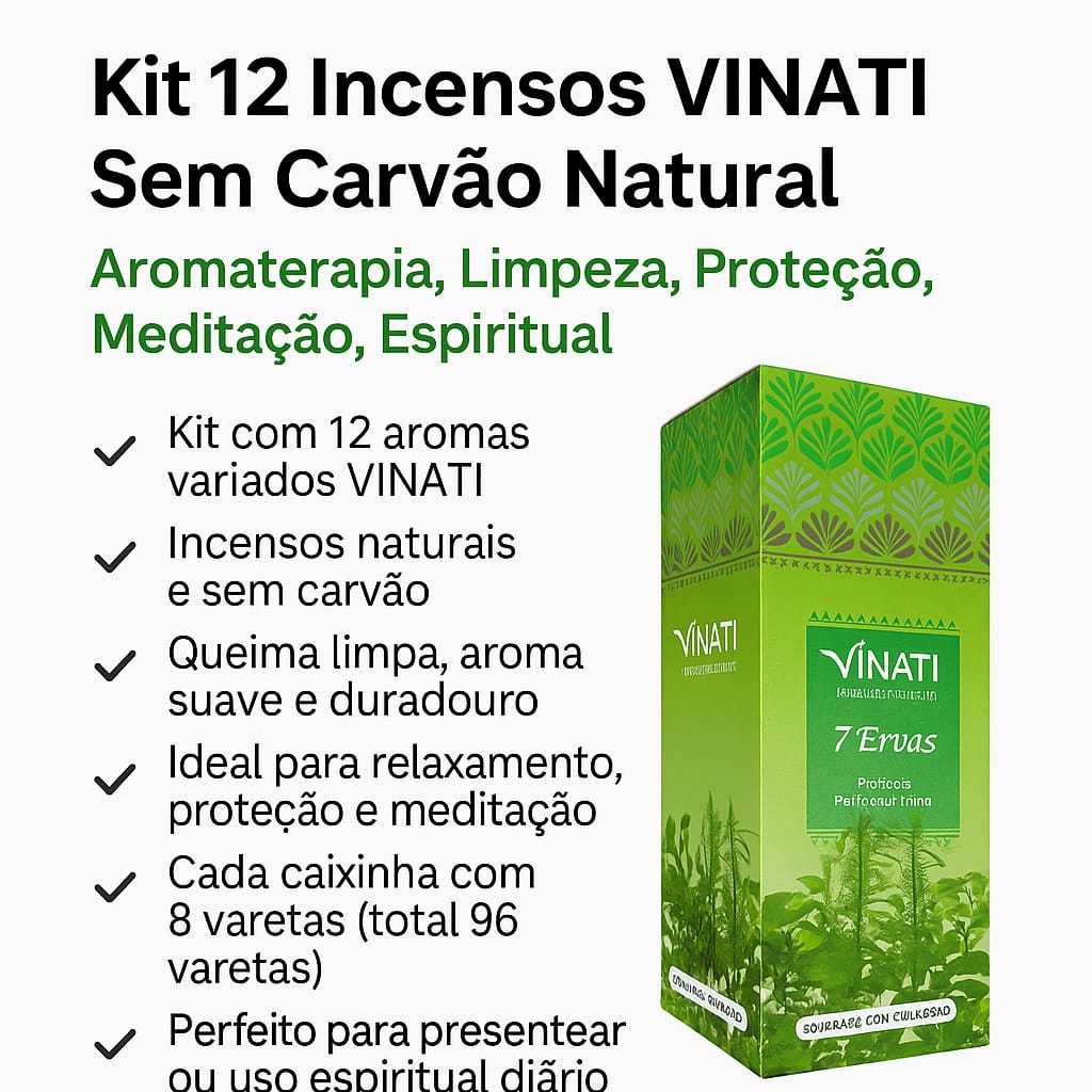Variação: Kit 10/12/18/25 Incensos (Sem Carvão) *AROMAS SORTIDOS + Brinde Incensário Régua de Madeira Indiano Leve para sua casa uma seleção exclusiva de Incensos sem carvão da marca VINATI. Cada aroma foi escolhido para trazer mais harmonia, bem-estar e espiritualidade para o seu dia a dia. ✅ Queima limpa e natural ✅ Aromas intensos e duradouros ✅ Ideal para meditação, oração, relaxamento ou limpeza energética ✅ Produto artesanal – qualidade e essência mais pura ✅ Cada caixinha contém 8 varetas --- Perfeito para: Meditação 🧘 Rituais espirituais ✨ Limpeza energética 🔮 Relaxamento e autocuidado 💆 Presentes espirituais 🎁 --- Produto 100% Natural Sem carvão, com aroma mais puro e agradável.