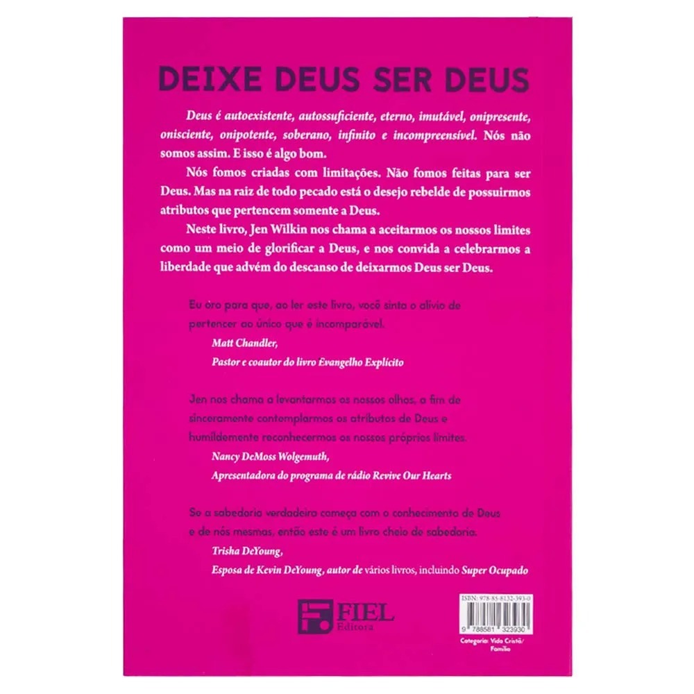 Deus é autoexistente, autossuficiente, eterno, imutável, onipresente, onisciente, onipotente, soberano, infinito e incompreensível. Nós não somos assim. E isso é algo bom. Nós fomos criadas com limitações. Não fomos feitas para ser Deus. Mas na raiz de todo pecado está o desejo rebelde de possuirmos atributos que pertencem somente a Deus. Neste livro, Jen Wilkin nos chama a aceitarmos os nossos limites como um meio de glorificar a Deus, e nos convida a celebrarmos a liberdade que advém do descanso de deixarmos Deus ser Deus. 204 páginas 21x14cm