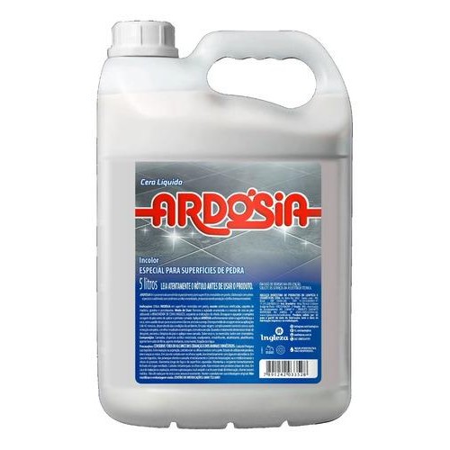 Cera Ardósia Incolor Ingleza 5 Litros. Indicação: Cera líquida desenvolvida especialmente para superfícies revestidas em pedra e ardósia. Elaborada com ativos especiais, e aditivada com polímero acrílico metalizado, proporciona proteção e brilho intenso renovável. Modo de usar: Aplique a ARDÓSIA uniformemente sobre a superfície limpa e seca. A superfície ganhará brilho imediato. Se desejar intensificar o brilho, passe enceradeira com feltro. Em piso virgem, completamente isento de cera ou após remoção completa, o melhor resultado ocorrerá após a terceira camada, com o tempo médio de secagem entre as camadas de 45 minutos, dependendo das condições do ambiente