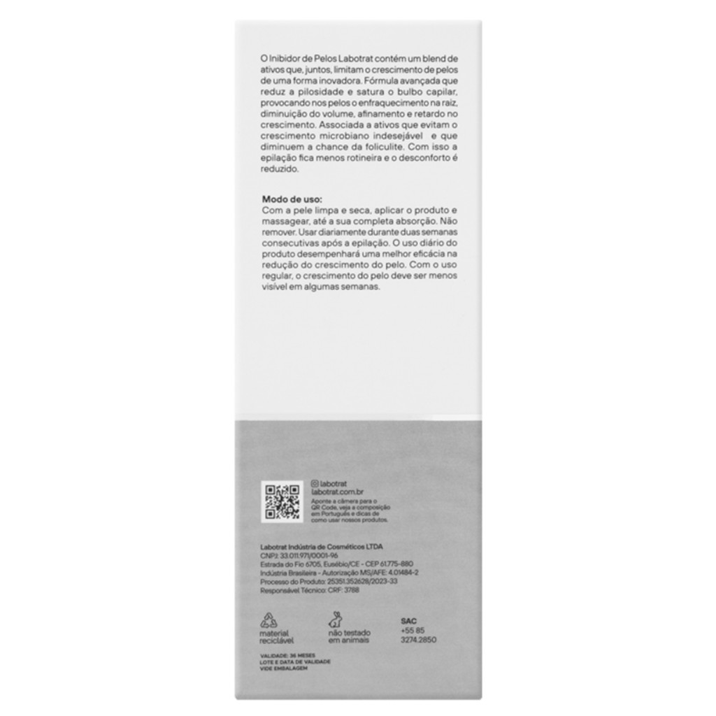 Inibidor De Pelos Labotrat Dermoskin 140ml O Inibidor de Pelos Labotrat contém um blend de ativos que, juntos, limitam o crescimento de pelos e reduzem a pilosidade de uma forma inovadora. Fórmula avançada que reduz a pilosidade e satura o bulbo capilar, provocando nos pelos o enfraquecimento na raiz, diminuição do volume, afinamento e retardo no crescimento. Com isso a epilação fica menos rotineira e o desconforto é reduzido. Adicionamos ativos que evitam o crescimento microbiano indesejável e que diminuem a chance da foliculite. Modo de usar: Com a pele limpa e seca, aplicar o produto e massagear, até a sua completa absorção. Não remover. Usar diariamente durante duas semanas consecutivas após a epilação. O uso diário do produto desempenhará uma melhor eficácia na redução do crescimento do pelo. Com o uso regular, o crescimento do pelo deve ser menos visível em algumas semanas. Precauções: Evitar contato com olhos e mucosas. Caso isso ocorra, enxaguar abundantemente com água. Não utilizar sobre a pele irritada ou lesionada. Em caso de irritação, suspender o uso e procurar orientação médica. O produto não deve ser utilizado por pessoas hipersensíveis a qualquer componente da fórmula. Por conter ingredientes de origem natural, poderá ocorrer variações na cor do produto, sem que haja alterações de suas propriedades. Conservar em local fresco, ao abrigo da luz e calor excessivos. Não ingerir.