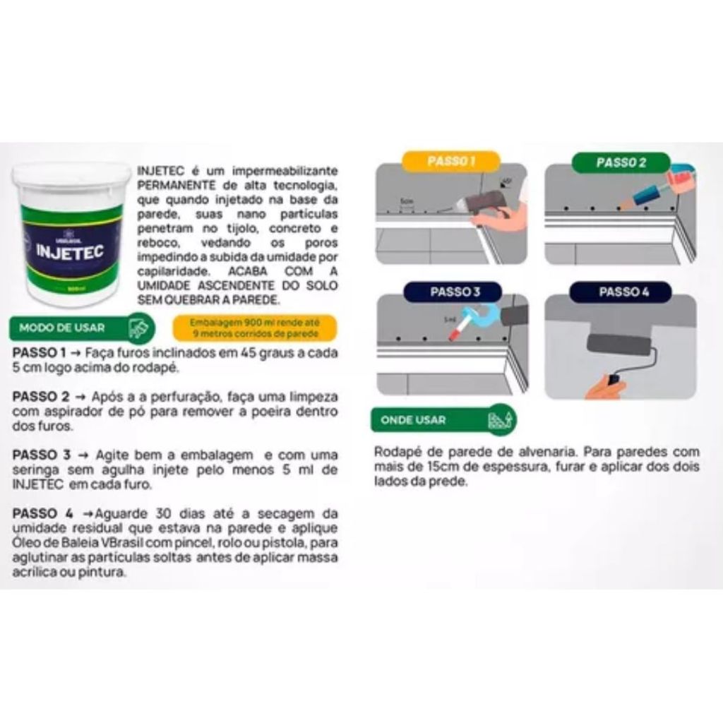 Injetec Impermeabilizante VBrasil 3,2L O Injetec® é um impermeabilizante de alta tecnologia. Nele contém nano partículas que penetram no concreto (substratos), vedando os poros, impedindo a capilaridade e a presença de umidade sem precisar quebrar ou demolir, sendo de fácil aplicação e injetável. Características: - Aplicação rápida e fácil; - Mono-componente, sem mistura, pronto para usar; - Aplicado a frio, não precisa de aquecimento; - Impermeabilização de umidade ascendente em paredes e colunas; - Não é necessário quebrar a parede para a aplicação, basta fazer pequenos furos e injetar o Injetec®; Rendimento de 15 metros de parede. Furos de 5 em 5 centímetros. Como aplicar o INJETEC: - Fure a parede na parte inferior no alinhamento do rodapé, com uma broca de 8mm ou 10mm; - Faça furos de 7cm de profundidade e distância de 5cm um do outro; - É necessário que os furos possuam uma leve inclinação para que o produto não escorra; - Recomenda-se aspirar o furo para retirar o pó gerado pela broca, aumentando ainda mais a eficiência do produto; Onde aplicar: Paredes e muros úmidos de alvenaria e/ou rejuntes de box de banheiro. Validade: 24 meses a partir da data de fabricação. Condições de estocagem: O produto deve ser estocado nas embalagens originais fechadas e intactas, em local fresco, seco e ventilado. Estocagem em altas temperaturas pode reduzir o prazo de validade.