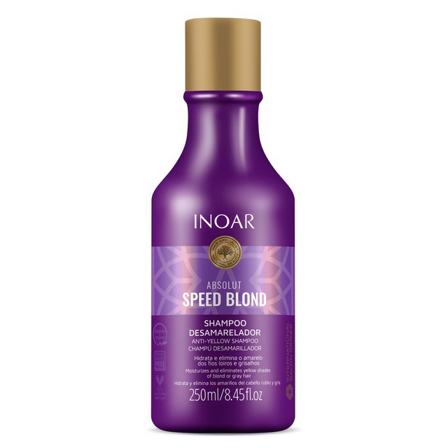 Inoar Absolut Speed Blond Shampoo 250ml Shampoo desamarelador para cabelos loiros ou grisalhos. Inoar Absolut Speed Blond limpa e neutraliza o amarelado que aparece nos fios claros com o passar do tempo. Graças à sua fórmula rica, ele também ajuda a hidratar e a nutrir, recuperando a saúde capilar. Inoar Absolut Speed Blond possui o pH neutro, ou seja, ele não interfere nas cutículas dos fios. Esse poderoso shampoo remove as impurezas e hidrata gentilmente, enquanto repõe os nutrientes perdidos e deixa seu platinado livre de manchas amarelas. Seu cabelo incrível como se você tivesse acabado de sair do salão de beleza. Ação: Óleo de Argan: hidrata e nutre os fios para que fiquem saudáveis, com maciez e brilho. Pigmentos Violeta: neutralizam o tom amarelo que fica nos fios claros com o tempo. Conselho de Aplicação: Passe o shampoo sobre o cabelo úmido massageando até a formação de espuma. Deixe agir por 3-5 minutos e, em seguida, enxágue. Use o shampoo até 2 vezes por semana.