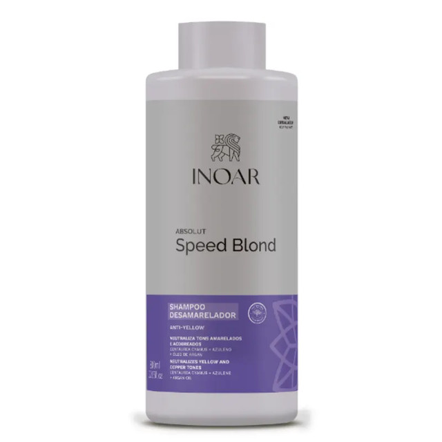 Inoar Absolut Speed Blond Shampoo 800ml Shampoo Desamarelador para cabelos loiros ou grisalhos. Inoar Absolut Speed Blond limpa e neutraliza o amarelado que aparece nos fios claros com o passar do tempo. Graças à sua fórmula rica, ele também ajuda a hidratar e a nutrir, recuperando a saúde capilar. O Shampoo Desamarelador Inoar Absolut Speed Blond possui o pH neutro, ou seja, ele não interfere nas cutículas dos fios. Esse poderoso shampoo remove as impurezas e hidrata gentilmente, enquanto repõe os nutrientes perdidos e deixa seu platinado livre de manchas amarelas e/ou acobreadas. Embalagem nova, mesma fórmula.
