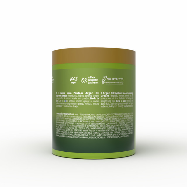 Inoar Argan Creme de Pentear 500g Argan Oil System é fonte poderosa de beleza capilar. Suas múltiplas funções hidratantes e disciplinantes transformam os fios fragilizados ou secos em sedosos, com aparência saudável e toque delicioso. Desembaraça e controla o frizz com o Inoar Argan Oil System Creme Para Pentear. Enriquecido com óleo de argan, jojoba e manteiga de cacau, proporciona hidratação, maciez e vitalidade instantâneas para todos os tipos de cabelo. Creme de Pentear para todos os tipos de cabelos. Cronograma Hidratação. 100% Vegano. Modo de usar: Com os cabelos limpos e úmidos, aplique o produto uniformemente no comprimento e pontas, mecha a mecha. Desembarace e finalize como desejar.