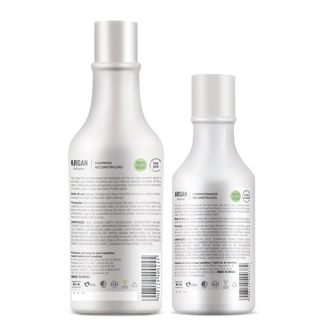 Inoar Argan Infusion - Kit Reconstrução 750ml Kit de cuidados para cabelos frágeis e quebradiços. Kit Inoar Argan Infusion Reconstrução devolve toda a resistência, aspecto saudável e maciez. Perfeito para quem sente o cabelo poroso, opaco e fraco, principalmente depois de processos químicos. Contém: Inoar Argan Infusion Reconstrução - Shampoo 500ml: revitaliza o cabelo e recupera toda a força. Inoar Argan Infusion Reconstrução - Condicionador 250ml: nutre ao mesmo tempo em que repara, além de selar cutículas. Ação: Óleo de Argan: hidrata e nutre os fios para um efeito de beleza, maciez e brilho. Queratina Vegetal e Ceramidas: repõem proteína ao cabelo enfraquecido e garante toque sedoso. Conselho de Aplicação: Aplique o shampoo sobre os fios úmidos e massageie o couro cabeludo. Quando surgir espuma, enxágue e repita se achar necessário. Pegue uma pequena quantidade do condicionador e passe do comprimento às pontas, sem aplicar na raiz. Penteie mecha a mecha e enxágue completamente.