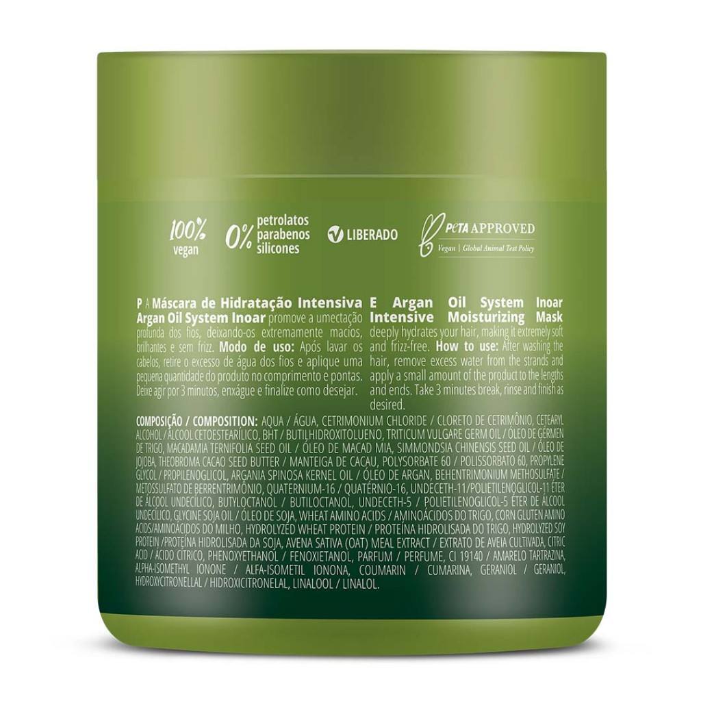 Inoar Argan Oil System Máscara 500g Argan Oil System é fonte poderosa de beleza capilar. Suas múltiplas funções hidratantes e disciplinantes transformam os fios fragilizados ou secos em sedosos, com aparência saudável e toque delicioso. A ampola devolvem maciez e tratam todos os tipos de fios. A linha possui também o primeiro óleo de Argan nacional, que reduz o frizz, deixando os fios muito mais hidratados. Ph Máscara 3.0 a 4.0 Vegano, Cruelty Free. Modo de usar: Após a lavagem dos cabelos retire o excesso de água com uma toalha, coloque uma quantidade adequada na palma das mãos e aplique nos cabelos úmidos, mecha a mecha, massageie e deixe agir por 15 a 20 minutos. Enxágue. Contém: 1- Inoar Argan Oil System Máscara 500g