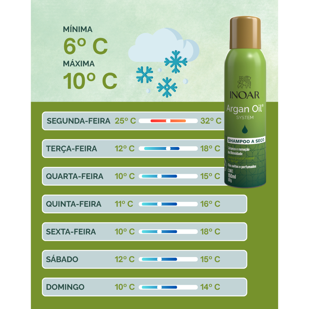 Inoar Argan Oil System Shampoo a Seco 150ml Chegou o Shampoo a Seco Argan Oil System, a solução prática para quem quer cabelos limpos, e leves e perfumados em pouco tempo! Com ação instantânea, ele remove a oleosidade excessiva da raiz sem ressecar, deixando os fios soltos, revitalizando e com um toque sedoso. - Fios soltos; - Cabelos perfumados - Sensação de limpeza; - Retira o excesso de oleosidade sem ressecar. Impulsionado pelo desejo dos consumidores por praticidade e cabelos impecáveis a qualquer momento. O novo Shampoo a Seco Argan Oil System da Inoar mantém os cabelos perfumados e livres da oleosidade. Modo de uso: Com os fios sempre secos, aplique de maneira uniforme a uma distâcia mínima de20cm. dos cabelos ou diretamente nas raízes mais oleosas. Deixe secar por 2 a 3 minutos e depois remova o pó com uma toalha sempre secaou pente. Não use o produto sobre cabelos limpos, pois eles podem ressecar. Contém: 1-Inoar Argan Shampoo a Seco 150ml