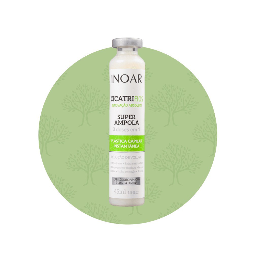 Inoar Cicatrifios - Super Ampola 45ml Ampola de tratamento para cabelos danificados. Inoar Cicatrifios Super Ampola reduz o volume, a quebra e o frizz com brilho extremo. Inoar Cicatrifios Super Ampola promove uma plástica capilar instantânea que hidrata, alinha e renova a fibra capilar para que o volume e os fios rebeldes sejam diminuídos gradativamente. Com 3 doses em apenas um frasco, também facilita o desembaraço, suaviza e deixa um toque sedoso duradouro. Pode ser usado em todos os tipos de cabelo. Ação: RejuComplex3: promove recuperação total da fibra capilar, sela os fios e reduz gradativamente o volume. Uma verdadeira plástica para fios disciplinados e renovados. Conselho de Aplicação: Depois de lavar os cabelos com shampoo, retire o excesso de água com uma toalha. Aplique uma quantidade suficiente da ampola mecha a mecha. Deixe agir por 3 minutos e enxágue. Resultado: Seu cabelo hidratado, macio, brilhante e progressivamente livre do frizz e do volume durante os 7 dias da semana.