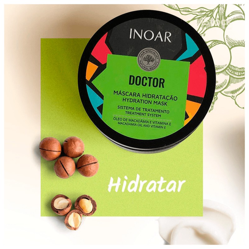 Inoar Doctor - Máscara de Hidratação 250g Máscara de Hidratação para todos os tipos de cabelo. Recupera a água necessária para a saúde dos fios. Inoar Doctor Máscara Hidratação é responsável por restaurar a hidratação, revitalizar e deixar o cabelo macio sem pesar. Conta com ativos naturais que penetram profundamente na fibra capilar e devolvem o movimento e o brilho. Ação: Extrato de Aloe Vera: é emoliente e tonificante, e assim devolve suavidade aos fios. Vitamina B5: repõe a hidratação de forma rápida e conserva a umidade natural por mais tempo no interior da fibra. Semi di Lino: restaura e contribui para o crescimento saudável dos fios. Conselho de Aplicação: Após lavar o cabelo, retire o excesso de água com uma toalha. Aplique uma pequena quantidade da máscara do comprimento às pontas. Deixe agir de 5 a 10 minutos. Em seguida, enxágue bem. Contém: 01- Inoar Doctor - Máscara de Hidratação 250g