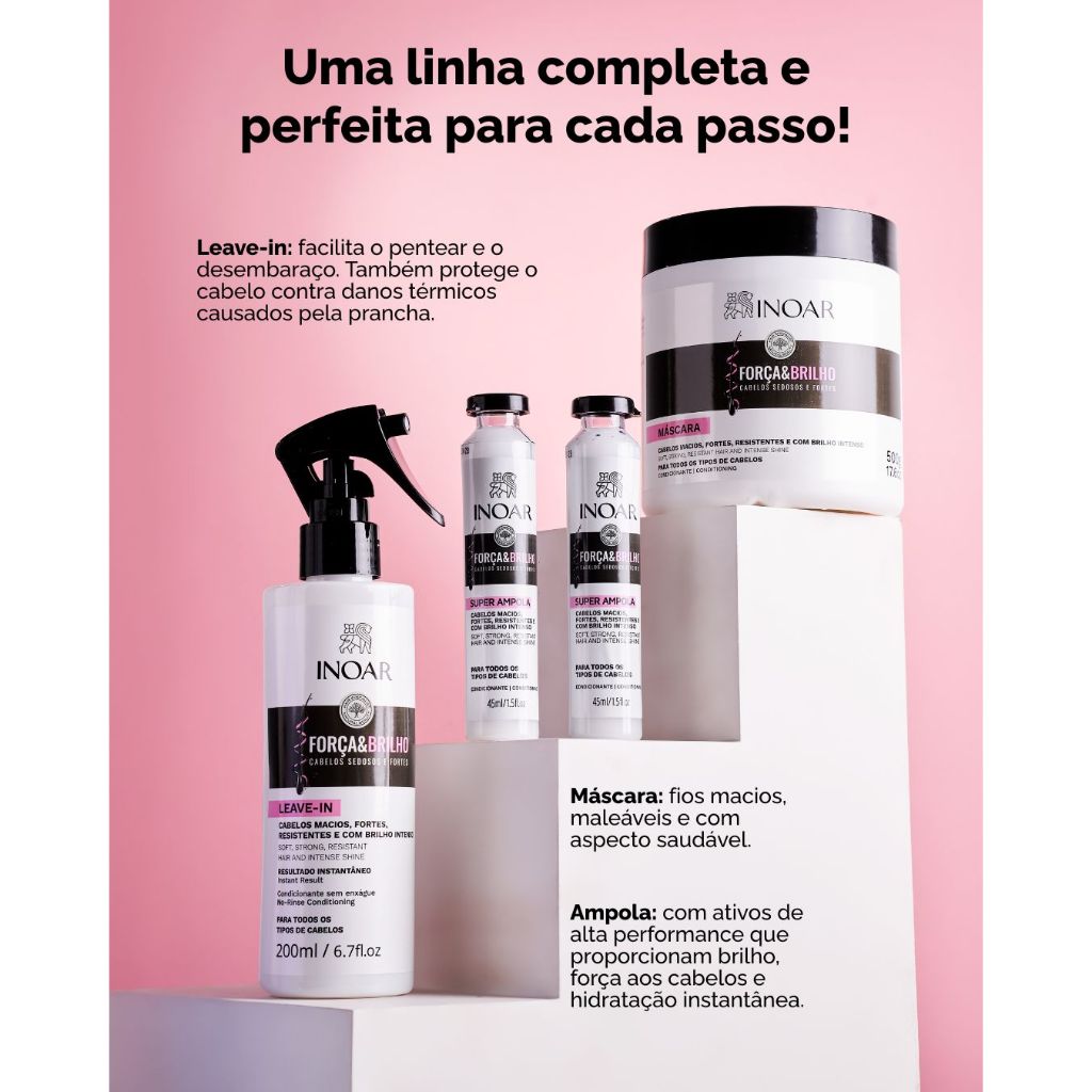 Inoar Força e Brilho Condicionador 500ml O Inoar Força e Brilho apresenta uma poderosa fórmula vegana que revitaliza e fortalece os fios, e garante cabelos mais fortes, brilhantes e macios ao toque, com redução visível de frizz, opacidade, aspereza e pontas duplas. Como usar: Após lavar o cabelo, aplique o condicionador Força e Brilho no comprimento dos cabelos, massageando mecha a mecha. Enxágue e finalize como desejar. Principais ativos: Extrato de babosa e biotina. Vegano, Cruelty Free. Contem: 1-Inoar Força e Brilho Condicionador 500ml