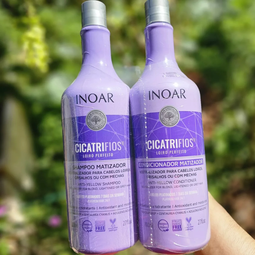 Kit Inoar Cicatrifios Loiro Perfeito (2 Produtos) Kit com shampoo e condicionador para cabelos loiros, grisalhos ou com mechas. Kit Inoar Cicatrifios Loiro Perfeito neutraliza tons indesejados enquanto cuida da fibra capilar. Kit Inoar Cicatrifios Loiro Perfeito traz uma fórmula com ativos especiais para deixar os fios saudáveis e com a cor impecável, agindo na correção do amarelado dos fios desde o primeiro uso. É ideal para proporcionar um cabelo macio, brilhante e com a nuance mais fria. Contém: Inoar Cicatrifios Loiro Perfeito - Shampoo 800ml: limpa suavemente e ajuda a neutralizar o tom amarelado. Inoar Cicatrifios Loiro Perfeito - Condicionador 800ml: condiciona intensamente os fios enquanto neutraliza tons amarelados indesejados. Como Usar: Kit Inoar Cicatrifios Loiro Perfeito (2 Produtos) Conselho de Aplicação Aplique o shampoo sobre os cabelos molhados e massageie até obter espuma abundante. Deixe agir de 3 a 5 minutos, enxágue até a retirada completa do produto. Em seguida, aplique o condicionador. Utilizar até 2 vezes por semana. Após lavar os cabelos com o shampoo Inoar Cicatrifios Loiro Perfeito, aplique o condicionador em quantidade adequada, nos cabelos úmidos. Espalhe massageando mecha a mecha. Deixe agir por 5 minutos. Enxágue. Utilizar até 2 vezes por semana.