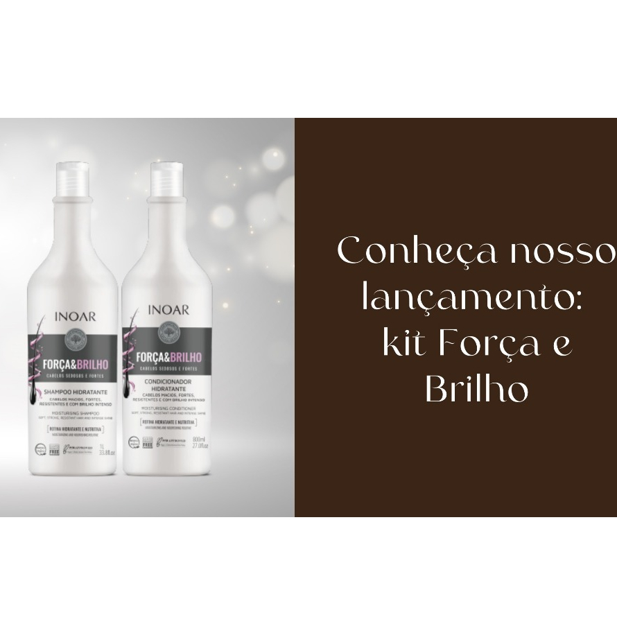 Inoar Kit Força e Brilho Shampoo 1L e Condicionador 800ml O kit Inoar Força e Brilho apresenta uma poderosa fórmula vegana que revitaliza e fortalece os fios, e garante cabelos mais fortes, brilhantes e macios ao toque, com redução visível de frizz, opacidade, aspereza e pontas duplas. Benefícios: - Condiciona e desembaraça. - Repõe os nutrientes, hidratando e fortalecendo. - Uso contínuo auxilia na recuperação da força dos cabelos. - Proporciona mais brilho e maciez para os fios. Ingredientes: -Matriz de Brilho: Hidratação profunda com óleos de Macadâmia, Oliva e Gérmen de Trigo. -Polímeros Suaves: Promove maleabilidade e hidratação imediata. -Blend Fortalecedor: Rico em proteínas vegetais e aminoácidos para fortalecer os fios. -Extrato de Babosa: Recupera a saúde dos fios e reduz sinais de frizz. -Biotina: Vitamina da beleza que estimula a produção de queratina, essencial para a saúde dos cabelos. - Contém óleos veganos que não deixam a sensação de peso nos fios. *Fórmula vegana