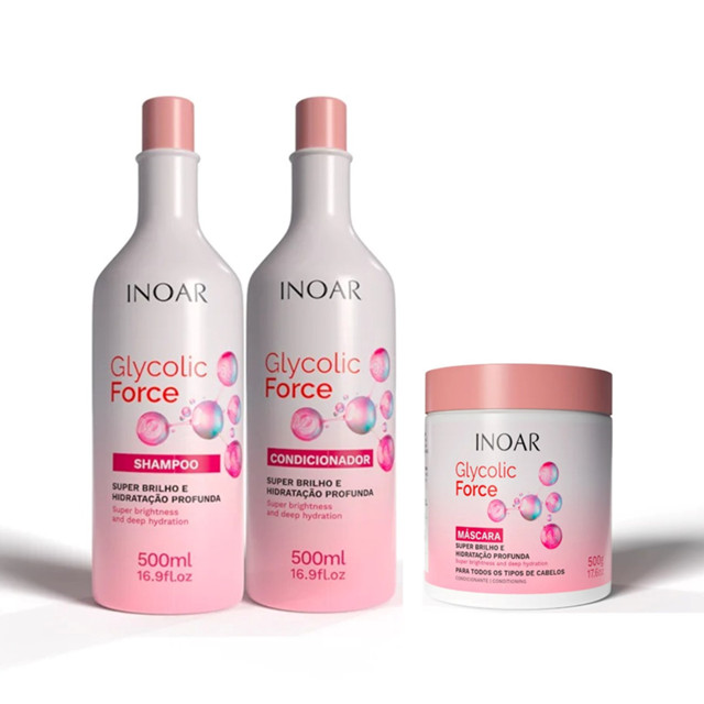 Inoar Kit Glycolic Shampoo e Condicionador 500ml + Máscara 500g Kit Shampoo + Condicionador Glycolic Force Inoar – 500ml Força, resistência e brilho extremo para cabelos frágeis ou danificados. O Kit Inoar Glycolic Force foi desenvolvido com tecnologia avançada para tratar profundamente a estrutura capilar, especialmente cabelos fragilizados por químicas ou agressões externas. Composto por ácido glicólico e biotina, esse poderoso duo fortalece os fios, reduz a quebra, hidrata intensamente e sela as cutículas, promovendo um visual saudável e revitalizado desde a primeira aplicação. Ideal para quem busca reconstrução capilar aliada a toque sedoso e brilho intenso. Resultado: Cabelos mais fortes, resistentes, hidratados, com brilho, maciez e redução visível da quebra. Tipos de Cabelo: Indicado para todos os tipos de cabelo, especialmente os que estão fracos, quebradiços ou danificados por químicas. pH: Shampoo: 5,0 – 6,0 Condicionador: 3,5 – 4,5 Composição (principais ativos): AQUA, GLYCOLIC ACID (Ácido Glicólico), BIOTIN (Biotina), além de agentes hidratantes, fortalecedores e restauradores que cuidam da fibra capilar de dentro para fora. Modo de Usar: Shampoo: Aplique nos cabelos molhados e massageie suavemente o couro cabeludo. Enxágue e, se necessário, repita a aplicação. Condicionador: Após o shampoo, aplique o condicionador no comprimento e pontas. Massageie, deixe agir por alguns minutos e enxágue bem. Etapa do Cronograma Capilar: Reconstrução (com ação de força e hidratação) Princípio Ativo: Ácido Glicólico e Biotina Pirâmide Olfativa: - Notas de saída: Lavanda e bergamota - Notas de corpo: Sândalo e âmbar - Notas de fundo: Baunilha e cedro Vegano e Botânico: Produto vegano, com ativos botânicos e cruelty-free (não testado em animais). Máscara de Hidratação Inoar Glycolic Force – 500g Hidratação profunda e reconstrução intensa com ação antifrizz e brilho radiante. A Máscara Glycolic Force da Inoar foi desenvolvida com alta concentração de ativos e ácido glicólico, proporcionando uma hidratação intensa, reparação profunda da fibra capilar e redução da porosidade desde a primeira aplicação. Sua ação restauradora age diretamente na estrutura dos fios, promovendo cabelos mais brilhantes, soltos, macios e com aparência saudável. Perfeita para todos os tipos de cabelo que precisam de um verdadeiro tratamento reconstrutor e nutritivo, especialmente os que sofrem com ressecamento, opacidade e frizz. Resultado - Hidratação profunda e imediata - Redução visível da porosidade - Brilho intenso, maciez e fios mais leves - Aparência saudável com toque sedoso Tipos de Cabelo Indicada para todos os tipos de cabelos, especialmente os que necessitam de hidratação e controle da porosidade. pH Máscara: Não especificado (mas equilibrado para hidratação) Composição (principais ativos) Contém: - Ácido Glicólico: ativo que repara e sela a fibra capilar - Manteiga de Manga: nutre profundamente - Dimeticonol e Silicone: criam um filme protetor com brilho - Guar Quaternizado: ação condicionante e desembaraçante - Ácido Cítrico: equilibra o pH dos fios - Perfume suave com notas sofisticadas Modo de Usar Após lavar os cabelos com o Shampoo Glycolic Force, aplique a máscara nos fios, mecha por mecha, massageando suavemente. Deixe agir por 3 minutos e enxágue completamente. Finalize como preferir. Etapa do Cronograma Capilar Hidratação – Ideal para repor a água e a maciez dos fios. Princípio Ativo Ácido Glicólico Pirâmide Olfativa - Notas de saída: Lavanda e Bergamota - Notas de corpo: Sândalo e Âmbar - Notas de fundo: Baunilha e Cedro Vegano e Botânico Fórmula vegana, botânica e não testada em animais (cruelty free).