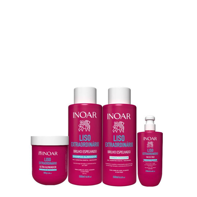 Inoar Kit Liso Extraordinário 4 Produtos A linha INOAR LISO EXTRAORDINÁRIO foi desenvolvida com tecnologia avançada para proporcionar fios lisos, alinhados e protegidos contra a umidade por até 10 dias. Com os ativos AHA, Queratina Vegetal e Niacinamida, os produtos atuam na reparação da fibra capilar, selagem das cutículas e combate ao frizz desde a primeira aplicação. Ideal para cabelos lisos, alisados ou com frizz. Essa é a rotina completa para um liso de alta performance, sem esforço. O futuro dos cabelos lisos chegou com INOAR LISO EXTRAORDINÁRIO. A sua linha de produtos capilares, que elimina o frizz e prolonga a duração do efeito liso, sem esforço. Modo se usar: Limpa gentilmente sem ressecar os fios, repara a fibra capilar, mantém os cabelos alinhados e combate à umidade. Contém: 1- Inoar Liso Extraordinário Shampoo 500ml 2-Inoar Liso Extraordinário Condicionador 500ml 3-Inoar Liso Extraordinário Máscara 500g 4-Inoar Liso Extraordinário Creme de Pentear 250ml