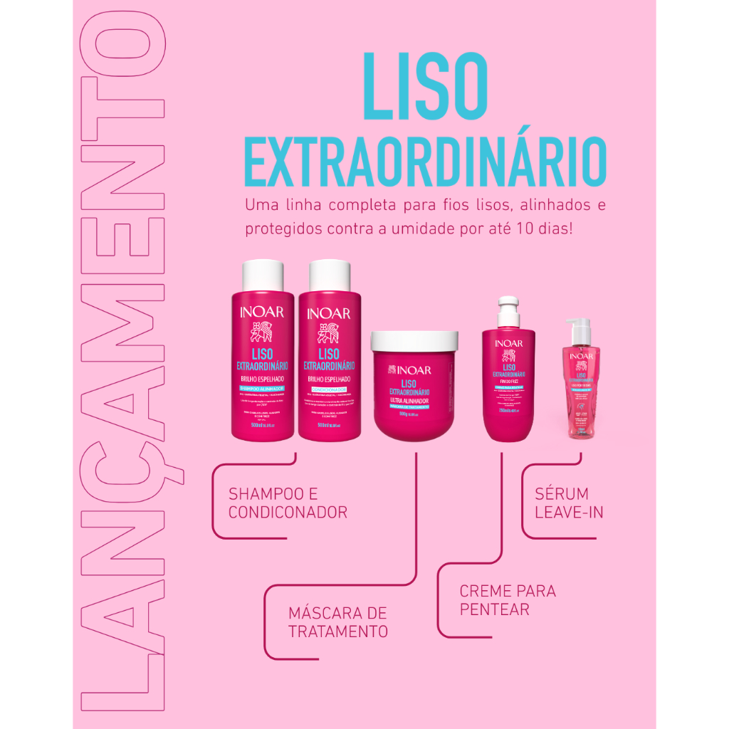 Inoar Liso Extraordinário Condicionador 500ml A linha INOAR LISO EXTRAORDINÁRIO foi desenvolvida com tecnologia avançada para proporcionar fios lisos, alinhados e protegidos contra a umidade por até 10 dias. Ideal para cabelos lisos, alisados ou com frizz. Essa é a rotina completa para um liso de alta performance, sem esforço. O futuro dos cabelos lisos chegou com INOAR LISO EXTRAORDINÁRIO. A sua linha de produtos capilares, que elimina o frizz e prolonga a duração do efeito liso, sem esforço. Condiciona a fibra capilar, alinha os fios sem pesar e fortalece a estrutura dos cabelos, reduzindo os danos causados por processos térmicos químicos. Contém: 1-Inoar Liso Extraordinário Condicionador 500ml