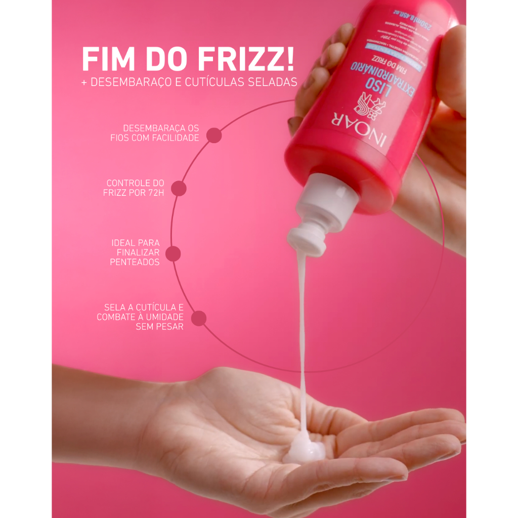 Inoar Liso Extraordinário Creme de Pentear 250ml A linha INOAR LISO EXTRAORDINÁRIO foi desenvolvida com tecnologia avançada para proporcionar fios lisos, alinhados e protegidos contra a umidade por até 10 dias. Com os ativos AHA, Queratina Vegetal e Niacinamida, os produtos atuam na reparação da fibra capilar, selagem das cutículas e combate ao frizz desde a primeira aplicação. Ideal para cabelos lisos, alisados ou com frizz. Essa é a rotina completa para um liso de alta performance, sem esforço. Liso por 10 dias: Fórmula inteligente ativada pelo calor do secador ou da chapinha. Com textura leve, promove o reali-nhamento dos fios, forma uma barreira invisível contra a umidade, sela as cutículas, combate o frizz e ajuda a proteger contra danos futuros. Com proteção térmica. Não é necessário enxaguar após a aplicação. Contém: 1-Inoar Liso Extraordinário Creme de Pentear 250ml