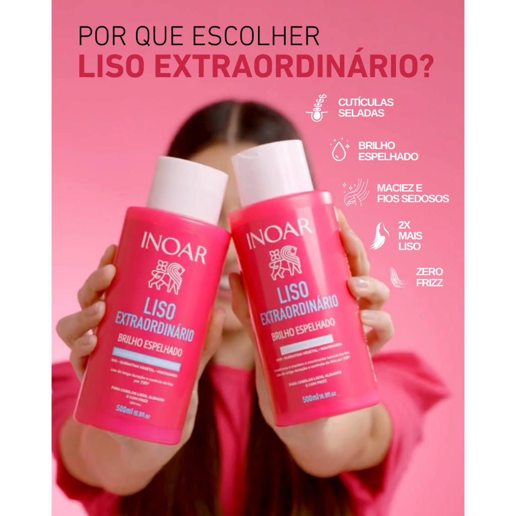 Inoar Liso Extraordinário Shampoo 500ml A linha INOAR LISO EXTRAORDINÁRIO foi desenvolvida com tecnologia avançada para proporcionar fios lisos, alinhados e protegidos contra a umidade por até 10 dias. Com os ativos AHA, Queratina Vegetal e Niacinamida, os produtos atuam na reparação da fibra capilar, selagem das cutículas e combate ao frizz desde a primeira aplicação. Ideal para cabelos lisos, alisados ou com frizz. Essa é a rotina completa para um liso de alta performance, sem esforço. Nossa fórmula avançada, impulsionada por AHA + Queratina Vegetal + Niacinamida, opera em tripla ação inteligente, realinhando a estrutura capilar e criando uma barreira invisível contra agentes externos. O futuro dos cabelos lisos chegou com INOAR LISO EXTRAORDINÁRIO. A sua linha de produtos capilares, que elimina o frizz e prolonga a duração do efeito liso, sem esforço. Modo se usar: Limpa gentilmente sem ressecar os fios, repara a fibra capilar, mantém os cabelos alinhados e combate à umidade. Contém: 1- Inoar Liso Extraordinário Shampoo 500ml