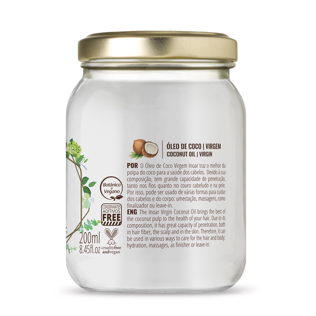 Inoar Óleo de Coco 200ml Óleo de coco virgem multifuncional para todos os tipos de cabelo, hidrata, nutre e traz saúde aos fios. Extraído diretamente da polpa, Óleo de Coco Inoar é extremamente rico em ativos naturais. Atribui muita emoliência e possui alto poder de penetração, tanto nos fios quanto no couro cabeludo. Ideal para ser usado em umectações, na máscara de tratamento, ou como finalizador. Ação: Óleo de coco virgem: é rico em diferentes vitaminas, nutre os fios porosos e desgastados, dá maciez, melhora a saúde do couro cabeludo e ajuda a selar as cutículas dos fios. Como Usar: Com uma espátula, pegue uma quantidade suficiente de óleo e espalhe bem entre as mãos até sentir que o óleo está diluído. Aplique no cabelo seco, penteando com os dedos, e deixe agir por quanto tempo achar necessário.