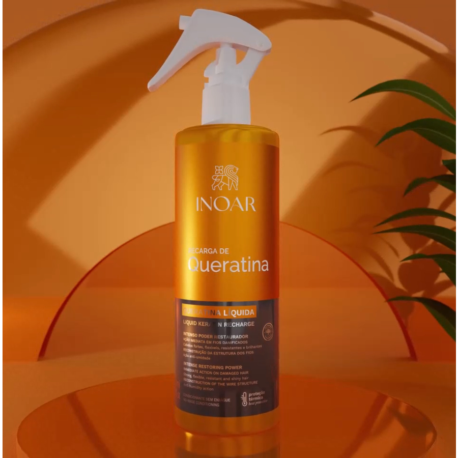 Inoar Recarga de Queratina Líquida 200ml Com fórmula exclusiva, a Recarga de Queratina Inoar apresenta duas versões: líquida e em creme, ambas atuando na cutícula e no córtex capilar, devolvendo o brilho e melhorando a elasticidade dos fios. Benefícios: -Cabelos fortes, flexíveis, resistentes e brilhantes; -Reconstrução da estrutura dos fios; -Proteção térmica; -Ação anti- umidade. Inoar Recarga de Queratina Líquida 200ml A queratina, uma proteína natural que constitui a estrutura básica dos cabelos, é essencial para a saúde e vitalidade dos fios. A Recarga de Queratina Inoar penetra profundamente na fibra capilar, reconstruindo a estrutura do fio e proporcionando uma resistência inigualável. Uso: Após lavar os cabelos, remova o excesso de água. Borrife a Recarga de Queratina Inoar do comprimento dos fios até as pontas. Prossiga com a escovação e finalize com a pranche. Sem enxágue. 100% Vegan