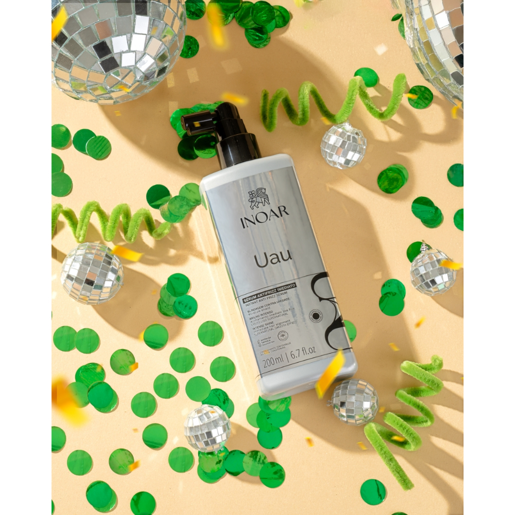Sérum de Blindagem Multifuncional UAU Inoar – 200ml O Sérum UAU da Inoar é a revolução para quem busca um cabelo impecável, sem frizz e com brilho espelhado. Sua fórmula ultraleve com polímero termoativado cria uma película invisível que se ativa com o calor do secador e a tração da escova, promovendo uma verdadeira blindagem contra umidade. O resultado? Fios perfeitamente alinhados, sedosos e com um efeito liso sobrenatural sem pesar ou deixar oleoso. Resultado - Ação antifrizz imediata - Brilho intenso e duradouro - Blindagem contra a umidade - Efeito liso supernatural e flexível - Alinhamento instantâneo dos fios - Proteção térmica potente Tipos de Cabelo Indicado para todos os tipos de cabelo, inclusive os mais indisciplinados ou com frizz excessivo. pH 3.5 – 4.5 Composição Aqua, Quaternium-18, Trideceth-6, Deceth-7, Cocamidopropyl Betaine, Dipropylene Glycol, Amodimethicone, Cetrimonium Chloride, Trideceth-12, Citric Acid, Disodium EDTA, Panthenol, Phenoxyethanol, Sodium Benzoate, Parfum, Hexyl Cinnamal, Linalool. Modo de Usar Após lavar com shampoo e condicionador, retire o excesso de água com uma toalha. Divida os cabelos em mechas e borrife o produto generosamente nos fios úmidos (não encharcados). Em seguida, escove e/ou finalize com chapinha para ativar a tecnologia termoativada. Esse passo é essencial para garantir os resultados incríveis da blindagem. Etapa do Cronograma Hidratação Princípio Ativo - Polímero termoativado - Matriz hidrofóbica - Pantenol Pirâmide Olfativa - Família olfativa: floral amadeirada oriental - Notas de saída: lavanda e bergamota - Notas de corpo: sândalo e âmbar - Notas de fundo: baunilha e cedro Vegano e Botânico Produto vegano e com formulação botânica, livre de ingredientes de origem animal e com ativos vegetais que tratam sem agredir os fios nem o meio ambiente.