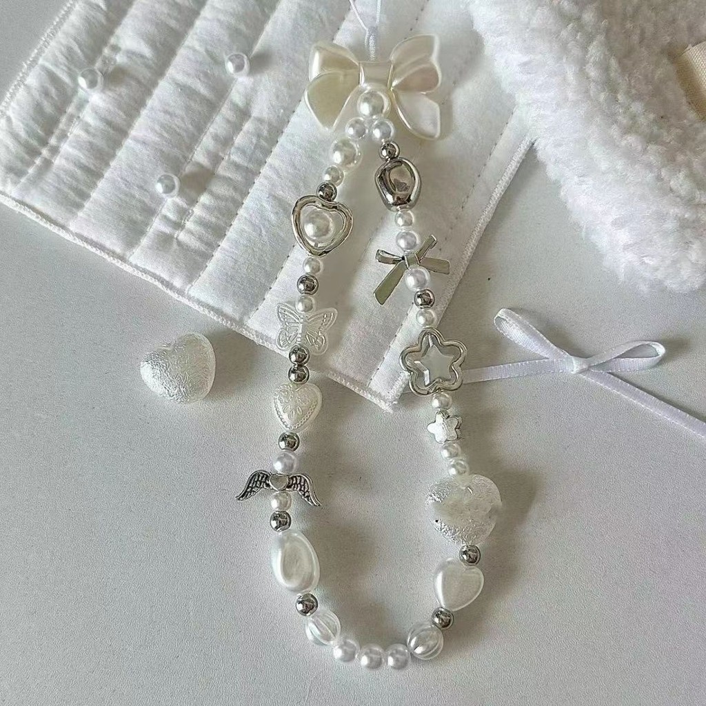 INS Coreano Bonito Arco Branco Coração Pérola Contas Frisado Corrente De Telefone Para Câmera Do iPhone Pendurado Corda