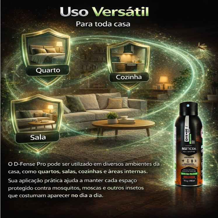 Inseticida D-Fense Pro Ambiente 250ml — Tecnologia One Push O D-Fense Pro Ambiente é um inseticida aerosol desenvolvido para auxiliar no controle de insetos em ambientes internos. Sua tecnologia de dispersão libera micropartículas que se espalham pelo ar, contribuindo para atingir insetos presentes no ambiente. Com sistema One Push, basta uma aplicação rápida para que o produto se disperse no ambiente de forma prática. O produto pode ser utilizado em diversos espaços da casa, como quartos, salas e cozinhas, ajudando a manter o ambiente mais confortável. Principais benefícios: ✔ Tecnologia de dispersão eficiente ✔ Sistema de aplicação rápida One Push ✔ Proteção de até 48 horas* ✔ Pode ser utilizado em diferentes ambientes da casa ✔ Aplicação simples e prática *O tempo de proteção pode variar conforme o ambiente e condições de uso. Modo de uso: Agite antes de usar. Realize uma aplicação rápida direcionada ao ambiente desejado seguindo as orientações do rótulo do produto. Conteúdo da embalagem: 1x Inseticida D-Fense Pro Ambiente 250ml Importante: Utilize conforme as instruções do fabricante e mantenha fora do alcance de crianças e animais domésticos.