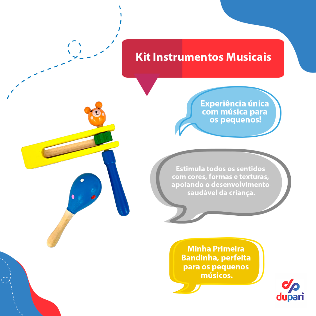 Nossos brinquedos estimula a coordenação motora, visão audição, interesse pela música e criatividade! Escolha o KIT que deseja nas variações! * KIT 2 PÇS: KIT 1. Flauta + Gaita KIT 2. Xilofone + Chocalho Reco KIT 3. Cabulete + Trompete KIT 4. Maraca + Catraca * KIT 3 Pçs: KIT 5. Xilofone + Gaita + Cabulete KIT 6. Chocalho Reco + Cabulete + Chocalho com Guizos KIT 7. Maraca + Trompete + Gaita *KIT 5 Pçs: KIT 8. Chocalho com Guizos + Cabulete + Maraca + Catraca + Trompete *KIT Completo 9pçs: KIT 9. Flauta + Chocalho reco + Chocalho Guizos + Trompete + Gaita + Cabulete + Maraca + Catraca + Ukulele - Flauta Infantil Material: MDF Medidas: 32,5 x 3,5 cm - Chocalho Reco Material: MDF Medidas: 14,5 x 4 cm - Chocalho com Guizos Material: MDF Medidas: 11x9 cm - Trompete Material: MDF Medidas: 18,5cm - Gaita Material: MDF Medidas: 13x2cm - Ukulele Material: MDF Medidas: 32,5 x 9,5 x 4 cm - Cabulete Material: MDF Medidas: 17cm - Maraca Material: MDF Medidas: 13cm - Catraca Material: MDF Medidas: 13x15cm - Xilofone Material: MDF Medidas: 24x12cm Atenção: as cores são enviadas de maneira SORTIDA, não sendo possível escolher cor.