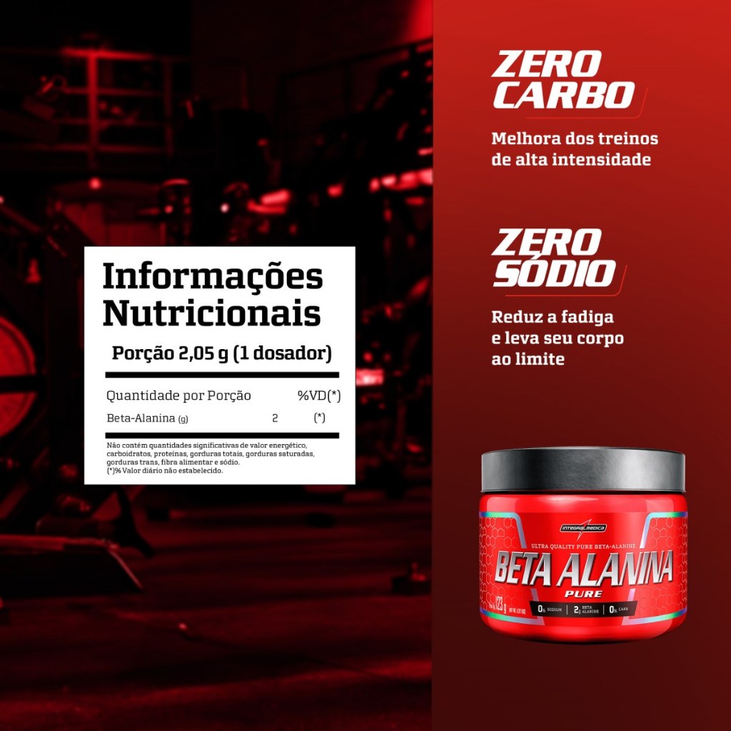 Aumente sua energia e ultrapasse limites com Beta Alanina Integralmedica. Com 2g por porção, este suplemento retarda a fadiga muscular, reduz a sensação de queimação e mantém você focado para enfrentar treinos intensos com força e explosão muscular. Recupere-se mais rápido e proteja seus músculos. Com efeito antioxidante, a Beta Alanina combate o estresse oxidativo, acelera a recuperação e ajuda a manter o ritmo nos treinos. Livre de sódio, glúten e corantes artificiais, pode ser consumida pura ou misturada, antes ou após os exercícios. Desde 1983, somos pioneiros em suplementação esportiva no Brasil. Com mais de 40 anos de inovação e excelência, reunimos uma equipe de 620 pessoas apaixonadas por nutrição. Nosso grupo engloba marcas como Integralmedica, para atletas de alto desempenho; Darkness, voltada à intensidade; e Nutrify, focada em saúde equilibrada e natural.