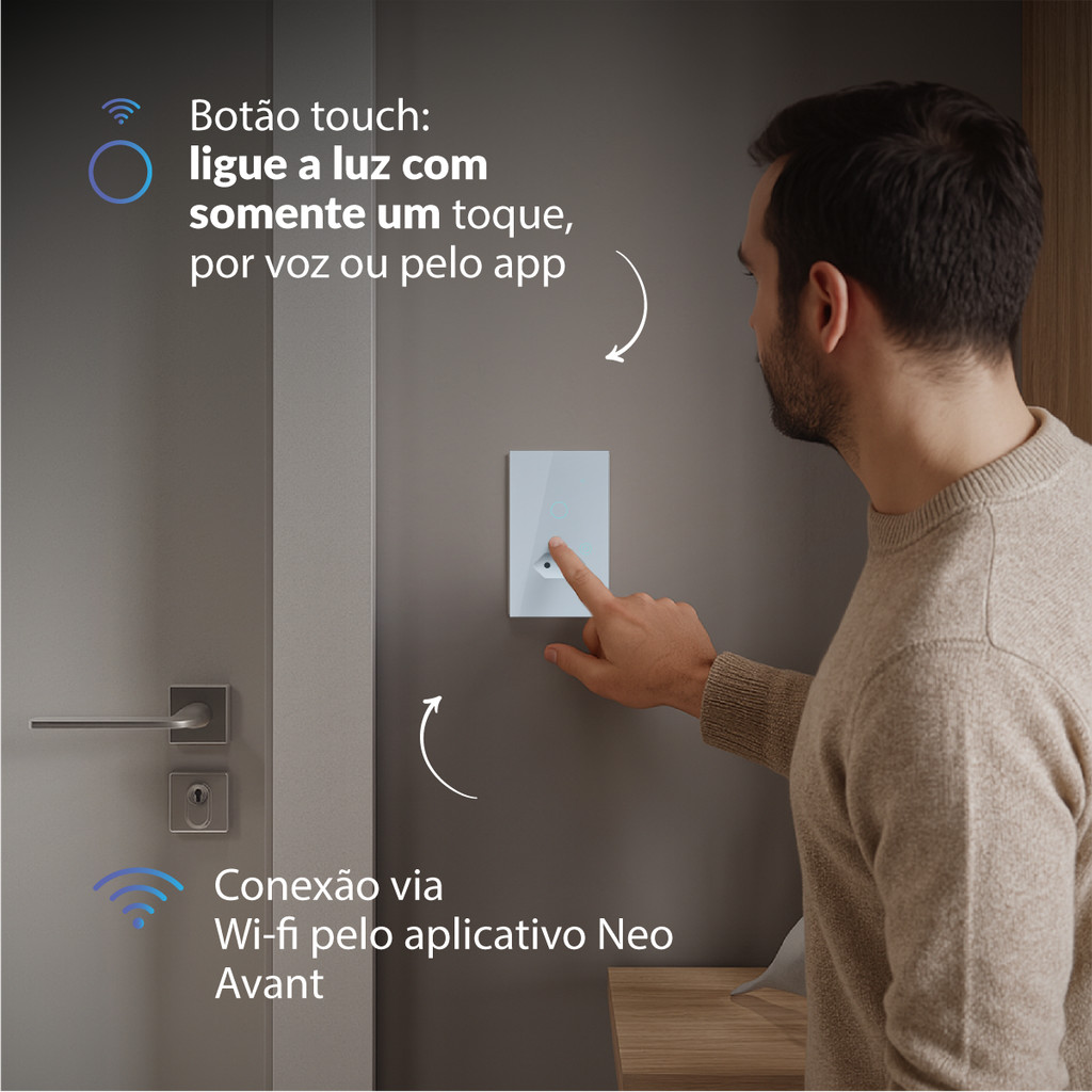 O Interruptor Inteligente com Tomada Neo Avant vem com é a solução ideal para quem busca praticidade e controle em seus ambientes. Permite o controle de suas luzes com aplicativo Avant Neo ou por comando de voz com Alexa ou Google Assistente. Características de Funcionamento: - Comando de voz com Alexa ou Google Assistente. - Aplicativo Avant Neo - 1 Botão (Controle ate 1 lâmpada) - 1 Tomada de 10a Embutida no Interruptor - Modelo com Wi-fi - Função de Programar Horários - Acabamento Premium - Tecla Touch Screen - Temporizador - Compatível com Qualquer lâmpada - Fácil Instalação - Modelo 4x2 Controle Remoto: ligue e desligue de qualquer lugar, a qualquer hora, através do aplicativo. Programação: defina horários para ligar ou desligar suas luzes automaticamente, otimizando sua energia. Compatível com Alexa e Google Assistente: controle seu interruptor com comandos de voz. Especificações Técnicas e Comerciais: Modelo: INTERRUPTOR NEO AVANT 1 BOTÃO COM TOMADA Cor: Branco Material: Polipropileno (corpo) e Vidro (Visor Touch) Peso: 250g Garantia: 12 Meses de garantia Oficial da marca para defeitos de fabricação. Sobre a Neo Avant: A Neo Avant é uma marca que busca oferecer soluções inovadoras e inteligentes em iluminação e automação residencial. Com produtos de alta qualidade e tecnologia de ponta.