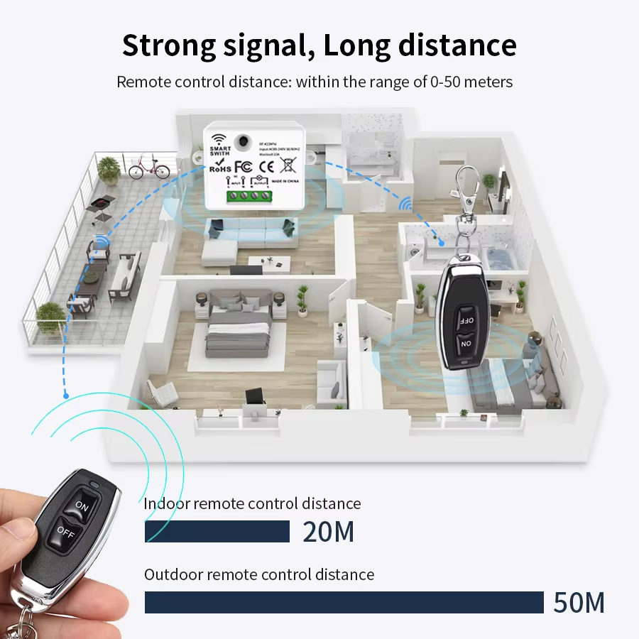 Tensão de funcionamento: AC 85V ~ 240V Corrente em repouso: <5mA Corrente máxima: 10A Carga máxima: 2200W Dimensões do corpo receptor: 47*42*27mm Frequência RF: 433MHz Pinos: L \ N Temperatura de funcionamento: -10~+70°C Sensibilidade de recepção: >97dbm Quantidade de controles remotos armazenados: 20 unidades Codificação suportada: EV1527 Código de aprendizagem Modo de operação RF: Recepção super-heterodina sem fio ASK Alcance de recepção: Em espaço aberto, mais de 20-100 metros Modo de operação do controle remoto: Modo de alternância / Modo de travamento Sinais de interruptor sem fio 433MHz Como obter os sinais Passo 1: Pressione o botão de aprendizado (no receptor) duas vezes. Aguarde 3 segundos; Passo 2: Pressione um botão no controle remoto. Aguarde 3 segundos. Sucesso. Como limpar os sinais Somente um passo: Pressione o botão de aprendizado (no receptor) 8 vezes. Características: 1. Controle remoto múltiplo pode controlar diferentes receptores. Economize energia, evite a escuridão. 2. Funciona com todos os tipos de luzes e ventiladores de teto. Lâmpadas LED, CFL, fluorescentes podem suportar até 300W, outras podem suportar até 2500W. 3. É um painel de parede 86 que pode ser colado em qualquer lugar. É um transmissor de código de aprendizagem com chip IC EV1527. Pode ser aprendido na maioria dos receptores de código de aprendizagem.