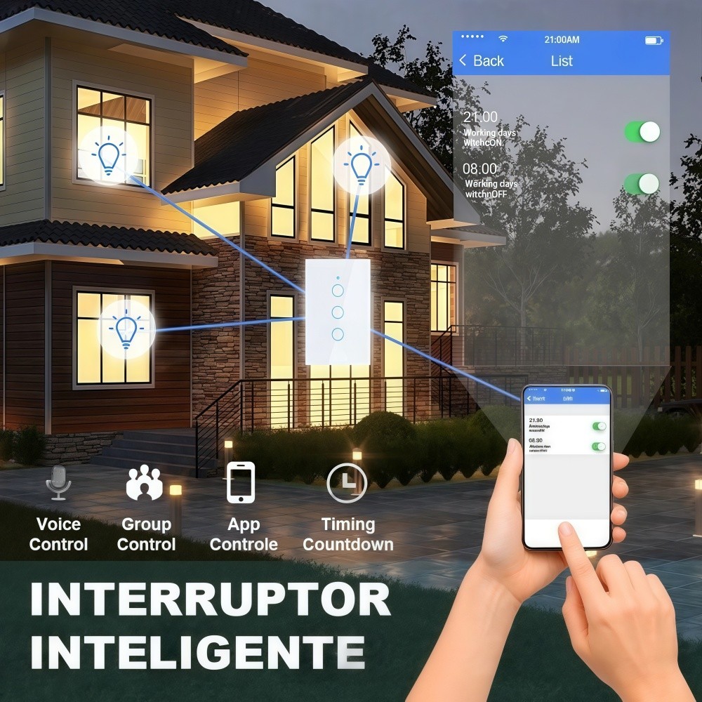 🏠 Automatize sua casa – Tenha mais conforto e praticidade, ligando e desligando suas luzes com apenas um toque em seu smartphone de qualquer lugar e a qualquer hora. ⏰ Crie cenários – Programe seu Interruptor Inteligente, para ligar e desligar em horários específicos de acordo com sua rotina. 👨👩👧👦 Compartilhe – Compartilhe seu Interruptor Inteligente com os membros de sua família. ⚡ Instalação compatível – A instalação deste modelo é compatível com caixas 4x2 (padrão brasileiro). 🔌 Instalação elétrica – O interruptor deve ser instalado com o fio fase. 📱 APLICATIVOS COMPATÍVEIS PARA CELULAR: 📲 SMART LIFE 📲 TUYA 🗣️ SISTEMAS DE VOZ COMPATÍVEIS: 🎤 GOOGLE HOME 🎤 ALEXA 🎤 SIRI 👐 Está com as mãos ocupadas? Utilize sua voz para apagar ou acender as luzes! EXEMPLO 1: "OK Google (ALEXA) Apagar luz do quarto!" EXEMPLO 2: "OK Google (ALEXA) Acender luz da cozinha!" ⚙️ ESPECIFICAÇÕES: 🔌 Tensão – 100240V AC, 5060Hz, Fase 🔋 Corrente máxima – 16A Máxima 💡 Potência – 1000W (PF = 1.0, Lâmpada Incandescente) 💡 Potência – 300W (Iluminação de LED) 🌐 Tipo de Wi-Fi – 2,4GHz IEEE 802.11 b/g/n 📏 Distância – 30m (Roteador em visada direta) 📏 Distância – 5m (Com parede) 📦 CONTEÚDO DA EMBALAGEM: 1X – Inteligente Wi-Fi Painel Touch 1X – Guia para Aplicativo 1X – Guia para Usuário 2X – Parafuso Fenda Cruzada 📏 MEDIDAS: 117mm x 72mm x 40mm (C x L x A) ⚠️ ATENÇÃO!! ❌ NÃO POSSUI NEUTRO, APENAS O CAPACITOR