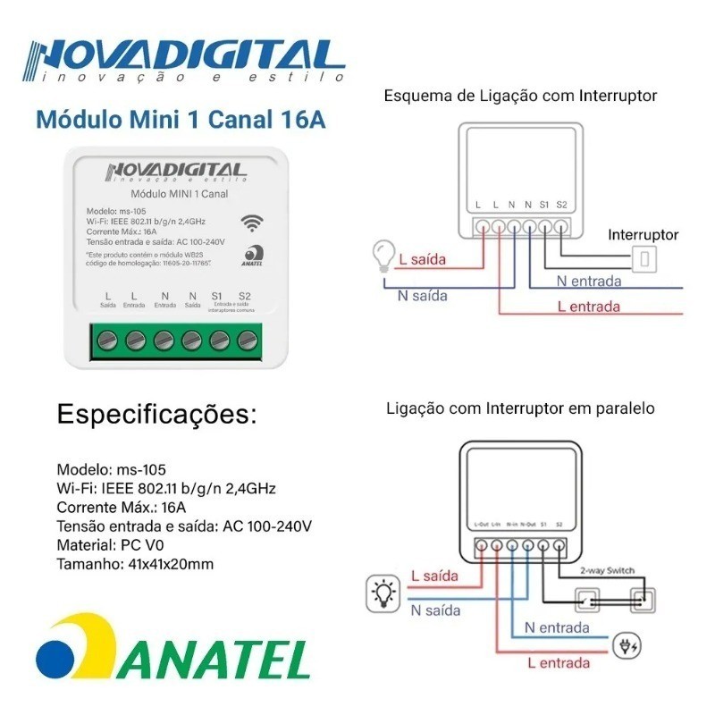 Automatize sua casa de forma simples e acessível! O Mini Módulo Wi-Fi Inteligente NovaDigital permite ligar e desligar luzes e aparelhos elétricos pelo celular ou por comando de voz, direto com Alexa ou Google Assistant. Ideal para quem quer transformar sua casa em um ambiente inteligente, com instalação rápida e controle total na palma da mão! ✅ Principais Vantagens: ✔️ Compatível com assistentes de voz: Alexa e Google Assistant ✔️ Controle remoto via celular – Apps Smart Life, Tuya ou NovaDigital ✔️ Agendamento de horários, temporizador e notificações no app ✔️ Fácil instalação – modelo compacto, cabe dentro da caixinha 4x2 ✔️ Wi-Fi 2.4GHz (não compatível com 5GHz) ✔️ Produto homologado pela Anatel ✔️ Ideal para automação de luzes, ventiladores, cafeteiras e mais ⚙️ Especificações Técnicas: Tensão de operação: 100V–240V AC (Bivolt) – 50/60Hz Corrente máxima: 16A Potência máxima: 1100W (110V) / 2200W (220V) Conexão: Wi-Fi 2.4GHz (IEEE 802.11 b/g/n) Controle via app: Smart Life, Tuya ou NovaDigital (iOS e Android) Material: Policarbonato anti-chamas (PC V0) Medidas: 4,1 x 4,1 x 2,0 cm Peso: 35g Modelo: MS-105 | Módulo: WB2S Cor: Branco Certificação ANATEL: 116052011765 1 canal (não dimmer) 📦 Conteúdo da Embalagem: 1x Mini Módulo Rele Wi-Fi Inteligente 1 Canal – NovaDigital 1x Manual em português ⚠️ Observações Importantes: Funciona somente com Wi-Fi 2.4GHz Desative temporariamente o 5GHz do roteador durante a configuração Antes do uso, faça o reset no botão físico do módulo Siga o passo a passo do aplicativo para configurar facilmente 💡 Indicado para: Automação residencial Controle inteligente de iluminação Integração com comandos de voz Projetos com caixa de embutir padrão 4x2 🔧 Transforme sua casa em uma Smart Home com baixo custo e alta eficiência!