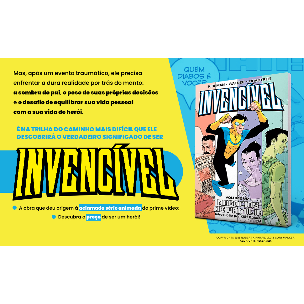 Garotas, espinhas, lição de casa e supervilões. Quando se é adolescente, ser Invencível vem bem a calhar. Mark Grayson era uma criança normal vivendo em um mundo cheio de super-heróis. Mas, ao alcançar a adolescência, ganhou poderes fantásticos graças ao seu pai, o Omni-Man. Ele agora é capaz de voar mais rápido do que um jato e erguer prédios como Hércules. Acompanhe as incríveis aventuras de Mark Grayson em sua jornada de descobertas e tenha revelações surpreendentes ao longo do caminho! Primeiro volume com preço especial de lançamento por apenas R$ 19,90. Segundo volume por apenas R$ 34,90. Terceiro volume em diante por R$ 49,90.