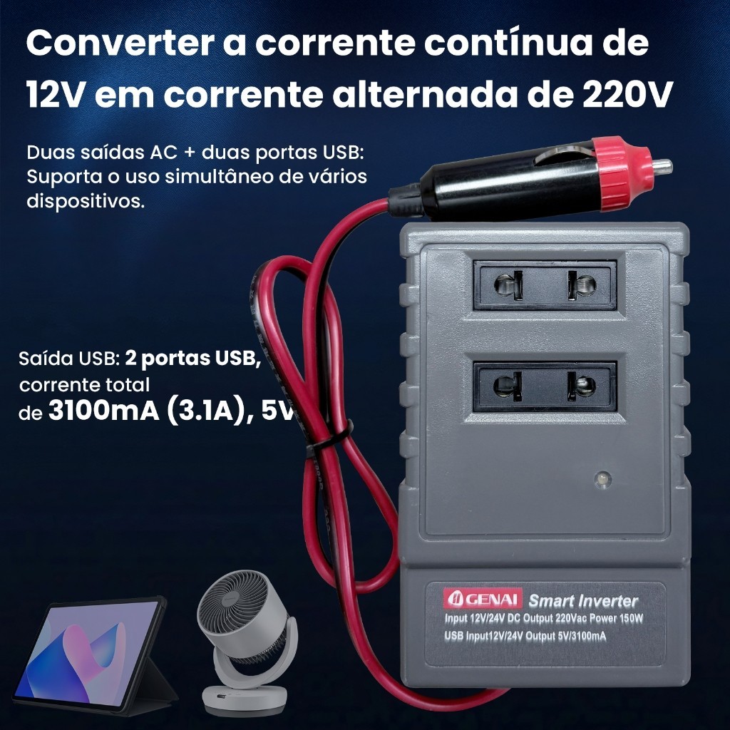 Transforme a energia do seu carro em uma tomada 220V portátil! O Inversor GENAI converte a corrente 12V DC do veículo em corrente alternada 220V (onda modificada), permitindo alimentar eletrônicos básicos, ferramentas e carregar dispositivos USB. Compacto, seguro e com múltiplas proteções, é essencial para viagens, trabalho remoto e emergências. Principais Características: Converte 12V DC da bateria do carro para 220V AC (Onda Modificada / Modificada). Possui 2 tomadas AC e 2 portas USB (total de até 3.1A) para uso simultâneo. Design compacto e portátil, conecta diretamente ao acendedor de cigarro do veículo. Sistema inteligente de proteção: contra sobretensão, sobrecarga, baixa voltagem e superaquecimento. Ventilação eficiente para operação estável e longa vida útil. Especificações Técnicas (Parâmetros): Modelo: GENAI (Série Inversor Onda Modificada) Tensão de Entrada (Input): 12V DC Tensão de Saída AC (Output): 220V ~ 50/60Hz Tipo de Onda: Onda Modificada (Modified Sine Wave) Potência Contínua: 150W (verifique o modelo específico) Saída USB: 5V DC / Máx. 3.1A (compartilhado entre as 2 portas) Proteções Incluídas: Sobrecarga, Curto-Circuito, Superaquecimento, Baixa/alta Voltagem. Tecnologia e Aviso Importante: Onda Modificada: Este inversor gera uma forma de onda elétrica "modificada" (não é onda senoidal pura). É compatível com a maioria dos aparelhos como lâmpadas, ferramentas elétricas, carregadores simples, ventiladores e equipamentos com motores universais. NÃO é recomendado para equipamentos eletrônicos sensíveis ou que possuam motor de velocidade variável (com controle preciso), como alguns notebooks avançados, equipamentos médicos, impressoras a laser ou fontes de áudio de alta fidelidade. Para estes, recomenda-se um inversor de Onda Senoidal Pura (Pure Sine Wave). Cenários de Uso (Onde Usar): Viagens de Carro: Carregar smartphones, tablets, câmeras, lanternas USB, ventoinhas portáteis. Trabalho Externo: Alimentar ferramentas elétricas pequenas (furadeira, lixadeira), equipamentos de iluminação. Lazer e Emergência: Usar em acampamentos para luzes, pequenos aparelhos, ou como fonte de energia de backup para carregar dispositivos essenciais durante falta de energia (conectado ao carro). Eventos Externos: Fornecer energia para decorações de LED, máquinas de algodão doce pequenas, etc. Conteúdo da Embalagem (Acessórios Incluídos): 1x Inversor Inteligente GENAI (Onda Modificada) 1x Cabo de alimentação com conector para o acendedor de cigarro do carro (12V) 1x Manual do Usuário (em português)