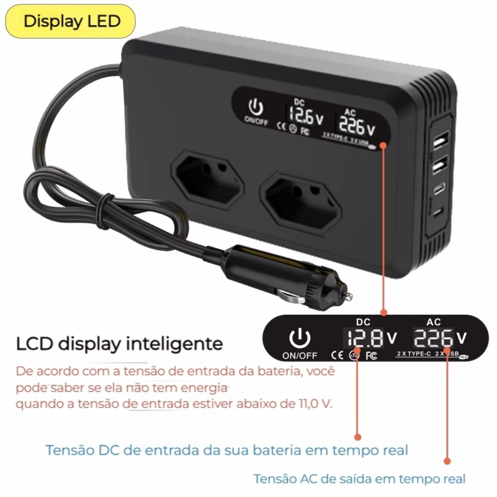 Inversor Veicular 200W AC110V Torquehammer oferece praticidade, segurança e desempenho em um único equipamento multifuncional. Com entrada DC12V e potência de saída de 200W (pico de até 400W), é ideal para alimentar e carregar diversos aparelhos em veículos, como celulares, notebooks, impressoras e pequenos eletroportáteis. Possui tela LCD inteligente que exibe em tempo real a tensão de entrada da bateria e a saída AC, além de indicar quando a bateria está com baixa carga. Conta com 2 portas USB, 2 entradas Tipo C e uma tomada AC, oferecendo ampla compatibilidade para diferentes dispositivos. Compacto e portátil, é perfeito para uso em viagens, acampamentos e atividades ao ar livre. ESPECIFICAÇÕES: - Modelo: VPL-3601 - Marca: Torquehammer - Entrada: DC12V (18A Max) - Saída AC: 110V - Potência de saída: 200W - Potência de pico: 400W - USB 1 + USB 2: 5V/4.8A, 25W total - Tipo C 1 + Tipo C 2: 5V/4.8A, 25W total - Tela: Display LCD inteligente - Dimensões: 160mm (L) x 43mm (C) x 84mm (A) - Função: Carga rápida - Refrigeração: Ventilação inteligente - Interruptor independente COMPATÍVEL COM: - Celular - Impressora - Notebook - Computador - Barbeador - Câmera - Gravador veicular - Mini geladeira automotiva - Aspirador portátil - Iluminação de camping - Entre outros... CONTEÚDO: 01 Inversor Veicular
