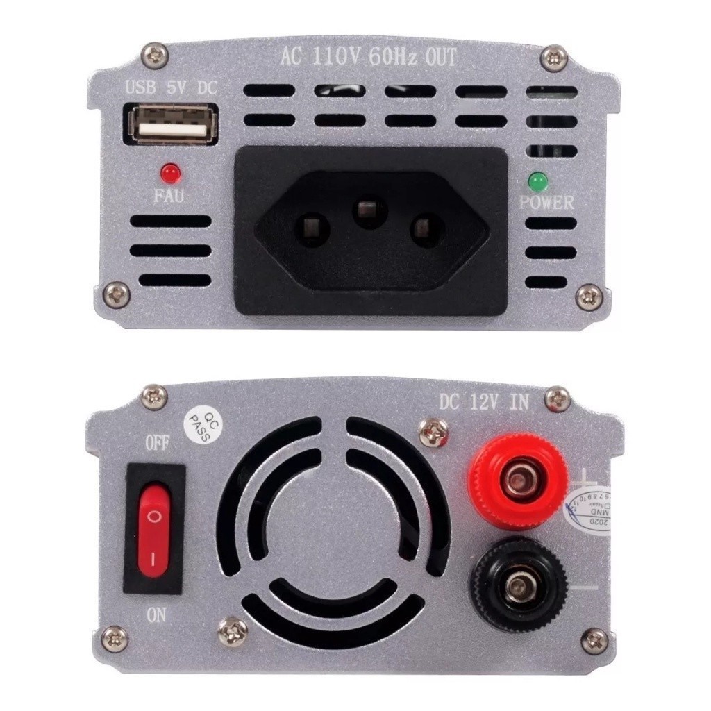Inversor de Energia / inversor de tensão 500w conversor, transformador 12v para 110v Com COOLER para refrigeração e proteção contra curto circuito. - Com esse Inversor Você poderá utilizar diversos equipamentos como, lâmpadas, aparelhos de som, televisores, dvds notebook, pc, carregadores de celular, sistemas de geração de energia solar entre outros. - Nosso inversor/Transformador é Extremamente útil em viagens, acampamentos, para ter dentro do seu carro, para uso onde não ha eletricidade, em casos de falta de energia elétrica, sistemas de energia solar, entre diversas outras aplicações. - Possui cooler com sensor inteligente, liga apenas quando a necessidade de resfriar. Ou seja, se não ligar de inicio, não significa que esta com defeito. - Nosso conversor possui ainda, Proteção contra curto circuito. **Não indicado para alguns aparelhos com motores, freezers, geladeiras, chuveiros e qualquer aparelho que consuma mais do que 500w. Produto destinado a uso com produtos leves, portáteis, etc.. Pode ser usado 24 horas por dia. Pode ser usado em sistema de energia solar. Dados técnicos: forma de onda: onda senoidal modificada possui 1 tomada novo padrão brasileiro tensão de entrada: 10 ~ 14,8 volts proteção de superaquecimento: sim potência: 500w tensão de saída 110v proteção de baixa tensão: 9,6v proteção de alta tensão: 14v frequência: 50-60 hz corrente sem carga: 0,4a proteção contra sobrecarga Itens no pacote: 1 Inversor de 500w 1 Par de garra jacaré para alimentação
