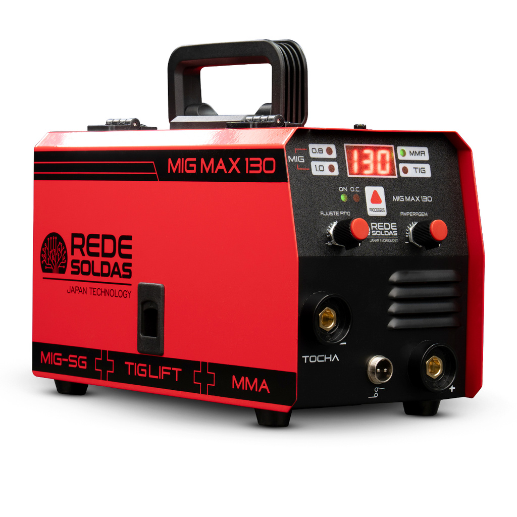 Você estará comprando: 01 Inversor de Solda 01 Tocha MIG Nine-Conector 01 Porta-eletrodo 01 Garra de terra 01 Arame Flux Core 1Kg 0,8mm 10 varetas 2,5mm Eletrodo 6013 Roldana de tração recartilhada "K" 0.8/1.0. Manual de Instruções: Completo e detalhado. O inversor de solda MIG-MAX-130 220V da REDE SOLDAS foi desenvolvido para modernizar e facilitar os trabalhos de soldagem. Este produto 3 em 1 é capaz de realizar três processos: MIG sem gás, TIG-LIFT e MMA. No processo MIG sem gás, a sinergia eletrônica simplifica a operação, permitindo resultados eficazes mesmo para operadores com pouca experiência. A inovadora Tocha Nine-Conector de engate rápido e plugue de duas vias oferece uma conexão simples, além de ser leve e resistente, ideal para aplicações de soldagem. A fonte de solda suporta rolos de arame de até 1 kg. Sua placa eletrônica utiliza tecnologia SMD (montagem robótica), com componentes de alta qualidade, proporcionando maior durabilidade e menor necessidade de manutenção. A tecnologia IGBT integrada ao bloco de potência oferece uma corrente de soldagem potente, com baixo consumo de energia elétrica. O projeto também inclui dispositivos térmicos de proteção e um cooler de alta capacidade, que aumentam o ciclo de trabalho, garantindo mais segurança e produtividade. Este inversor conta com 1 ano de garantia, sendo 9 meses de garantia contratual e 3 meses de garantia legal. Os inversores REDE SOLDAS foram projetados para tornar o seu trabalho mais rápido e eficiente, com foco em facilitar a operação, manutenção e proporcionar segurança, conforto e confiabilidade. Processo MIG sem gás: Alta produtividade e operação facilitada. Processo TIG-LIFT: Permite soldagem de chapas finas com acabamento superior (tocha não inclusa). Processo MMA (Eletrodo Revestido): Versatilidade para diversos tipos de solda. Função MIG - Sinergia Eletrônica: Ajuste automático da velocidade e tensão durante a soldagem MIG. Função MIG - Seleção de Diâmetro do Arame: Ajuste preciso de acordo com o diâmetro utilizado. Função MIG - Ajuste Fino de Tensão/Voltagem: Proporciona precisão em soldagens de chapas finas. Função MIG - Capacidade para Rolo de Arame de 1 kg: Ideal para pequenas e médias operações. Função MMA: Compatível diversos os tipos de eletrodo. Função MMA - Hot-Start Automático: Facilita a abertura do arco elétrico em diversos tipos e diâmetros de eletrodos. Função MMA - Arc-Force Automático: Controle inteligente que mantém o arco balanceado com estabilidade de corrente e tensão. Função MMA - Anti-Sticking Automático: Previne que o eletrodo fique colado na peça de trabalho, com resposta imediata ao curto. Alta Capacidade de Soldagem: Excelente ciclo de trabalho para longos períodos de operação. Ventilação Turbo: Refrigeração eficiente para desempenho contínuo. Proteção contra Sobreaquecimento e Sobretensão (Over Current O.C): Sistema automático de proteção da fonte de solda. Tecnologia IGBT: Fornece uma potente corrente de solda com baixo consumo de energia, maximizando a eficiência. MCU 32 Bits: Processador com software integrado, melhorando o desempenho e facilitando o uso do equipamento. Indicador de Proteção Térmica: Garantia de segurança e proteção contra superaquecimento. Display Digital: Ajustes precisos e de fácil visualização. Alça de Transporte: Leve, portátil e fácil de movimentar. CICLO DE TRABALHO MMA - ELETRODO REVESTIDO Eletrodo 2,0mm - 100% Eletrodo 2,5mm - 100% Eletrodo 3,2mm - 60% CICLO DE TRABALHO TIG-LIFT Tungstênio - 1.6mm - 100% Tungstênio - 2.0mm - 100% Tungstênio - 2.4mm - 60% CICLO DE TRABALHO MIG Arame 0.6mm - 100% Arame 0.8mm - 100% Arame 0.9mm - 100% Arame 1.0mm - 60% Informações Técnicas: Modelo: MIG-MAX-130 220V Marca: Rede Soldas Ligação: Tomada (20A) Frequência: 50/60 Hz Voltagem: 220V Potência: 5.302W Corrente de Entrada Máxima: 24.1A Corrente de Entrada Eficiente:14.2A Tensão no Vazio: 55V Conector: 9 mm + plug 2 vias Hot Start: Automático Arc Force: Automático Anti-Stick: Automático Dimensões: 150 x 290 x 230 mm Peso: 3,620 kg Amperagem - MIG 0.8mm: Mínima: 35A Máxima: 130A MIG 1.0mm: Mínima: 50A Máxima: 130A - TIG: Mínima: 15A Máxima: 130A - MMA: Mínima: 20A Máxima: 130A Capacidades e Consumíveis Capacidade do Alimentador: 1 kg Consumíveis MMA: Ø2,0 mm / Ø2,5 mm / Ø3,2 mm Consumíveis MIG: Ø0,6 mm / Ø0,8 mm / Ø0,9 mm / Ø1,0 mm Consumíveis TIG: Ø1,6 mm / Ø2,0 mm / Ø2,4 mm