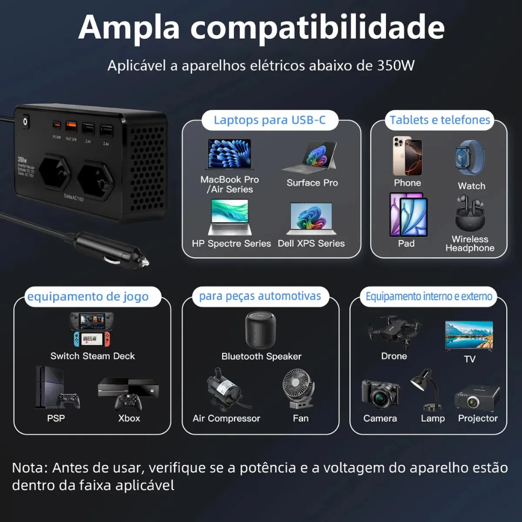 O Inversor Veicular BMAX BM-F1522 transforma a energia do seu carro em tomadas e portas USB de alta potência, permitindo carregar e alimentar diversos dispositivos durante viagens, trabalho externo ou situações de emergência. Com potência nominal de 350W, saída AC 110V, portas USB-A e USB-C de carregamento rápido (QC 3.0 e PD 24W) e duas tomadas padrão brasileiro, ele é ideal para notebooks, tablets, celulares, câmeras, caixas de som, mini impressoras, drones e pequenos eletrônicos. Possui display digital em LED, que exibe a voltagem de entrada do veículo em tempo real, garantindo mais segurança e controle. Conta com diversas proteções automáticas, como sobrecarga, curto-circuito, superaquecimento, subtensão e sobretensão — tudo para proteger o seu equipamento e o sistema elétrico do carro. Compacto, leve e fácil de instalar, basta conectar na entrada 12V (acendedor de cigarros) e começar a usar. Ideal para viagens longas, acampamentos, motoristas de app, caminhoneiros, fotógrafos, e qualquer pessoa que precisa de energia confiável fora de casa. CARACTERÍSTICAS: - Modelo: BM-F1522 - Tipo: Inversor Veicular / Conversor DC-AC; - Potência nominal: 350W; - Entrada: DC 11–16V; - Saída AC: 110V ±10%; - Frequência: 60Hz; - Tipo de onda: Onda Senoidal Modificada. PROTEÇÕES INTEGRADAS: - Proteção contra sobrecarga: Sim; - Proteção contra curto-circuito: Sim; - Proteção contra superaquecimento: Sim; - Proteção contra subtensão de entrada: 10,8 ± 0,5V; - Proteção contra sobretensão de entrada: 16,5 ± 0,5V. PORTAS USB: USB-C PD 24W (PD 3.0): - 5V/3A - 9V/3A - 12V/2A USB-A FAST 24W (QC 3.0): - 5V/3A - 9V/3A - 12V/2A 2x USB-A 2.4A: - 5V/2.4A Cada. CONTEÚDO DA EMBALAGEM: 01x Inversor Veicular 01x Manual de Uso.