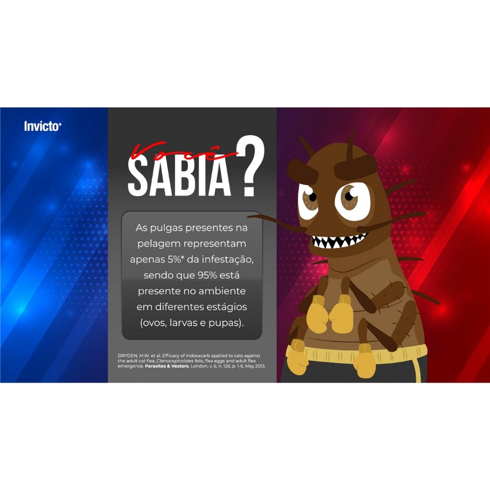 Validade: Outubro/2026 Invicto 11,4mg Antipulgas à base de Nitempiram indicado para o controle e infestação de pulgas em cães e gatos de pequeno porte. Invicto tem efeito Knock Down, ou seja, causa a morte imediata das pulgas, com início de ação a partir de 15 minutos, sendo ideal para eliminar infestações rapidamente. Invicto é seguro para o pet, pois é rapidamente eliminado do organismo do animal e não possui efeito residual. Mais de 90% do princípio ativo é eliminado por via urinária, dentro de 24 horas em cães e 72 horas em gatos. Alívio Imediato Tratamento oral de rápida ação Rapidamente absorvido pelo organismo. Indicado para cães e gatos com até 11,4 kg. O medicamento não possui atividade persistente no organismo do animal, ou seja, não previne novas reinfestações. Como o fármaco é rapidamente eliminado do organismo, sendo que mais de 90% do ativo é eliminado pela urina, dentro de 24 e 72 horas em cães e gatos, respectivamente, para prevenir reinfestações, recomenda-se um tratamento adequado para controlar os estádios imaturos do ciclo de vida da pulga. O médico veterinário deverá estabelecer um regime de tratamento adequado. Apresentação: Caixa com 1cpr, 6cpr e 20cpr.