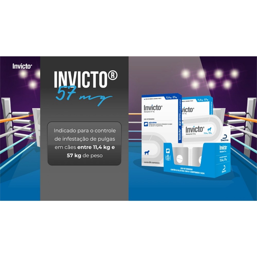 Validade: Outubro/2026 Invicto Cães 57mg À base de Nitempiram é indicado para o controle e infestação de pulgas em cães de todos os portes. Invicto tem efeito Knock Down, ou seja, causa a morte imediata das pulgas, com início de ação a partir de 15 minutos, sendo ideal para eliminar infestações rapidamente. Invicto é seguro para o pet, pois é rapidamente eliminado do organismo do animal e não possui efeito residual. Mais de 90% do princípio ativo é eliminado por via urinária, dentro de 24 horas em cães. Alívio Imediato Tratamento oral de rápida ação Indicado para cães de 11,4 kg a 57 kg Rapidamente absorvido pelo organismo O medicamento não possui atividade persistente. Para prevenir reinfestações, recomenda-se um tratamento adequado para controlar os estádios imaturos do ciclo de vida da pulga. O médico-veterinário deve estabelecer um regime de tratamento adequado. Contraindicações O Nitempiram não deve ser administrado em animais com sensibilidade conhecida ao ativo da fórmula. Não é recomendável a utilização deste medicamento em cães com menos de 12 meses de idade, cadelas prenhes e cães machos destinados à atividade reprodutiva. Em casos de dúvidas, consulte um médico-veterinário e leia a bula do Antipulgas Invicto Cães Dechra. Combater a infestação de pulgas e carrapatos é importante para a não proliferação de doenças. Apresentação: Caixa contendo 1cpr, 6cpr e 20cpr.