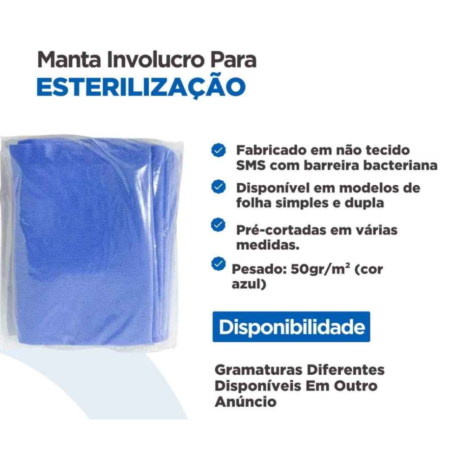 Material: Fabricado em não tecido SMS com barreira bacteriana. Gramatura: Leve. Pesado. Super pesado. Modelos Disponíveis: Folha Simples (cor azul). Folha Dupla (cor azul). Tamanhos: Diversos tamanhos. Indicação Uso: Embalagens para esterilização. Indicado como embalagem invólucro para proteger instrumentais cirúrgicos e materiais no processo de esterilização a vapor, óxido de etileno ou plasma de peróxido de hidrogênio. Apresentação Gramaturas e Cores: Leve: 40gr/m² (cor azul e verde). Pesada: 50gr/m² (cor azul e verde). Extra-pesada: 60gr/m² (cor azul e verde). Corte: Pré-cortadas em várias medidas. Cuidados As condições e características do produto estarão asseguradas dentro do seu prazo de validade, desde que a sua embalagem original não esteja danificada ou apresente sinais de violação. Caso a embalagem esteja danificada ou violada, não utilizar o produto e comunicar-se imediatamente com o fabricante. Manter fora do alcance das crianças. Condições de Armazenamento Manter o produto em local fresco e seco. Evitar poeiras, temperaturas e umidades elevadas, inclusive durante o seu transporte. Registro ANVISA Número de Registro: 80451210009
