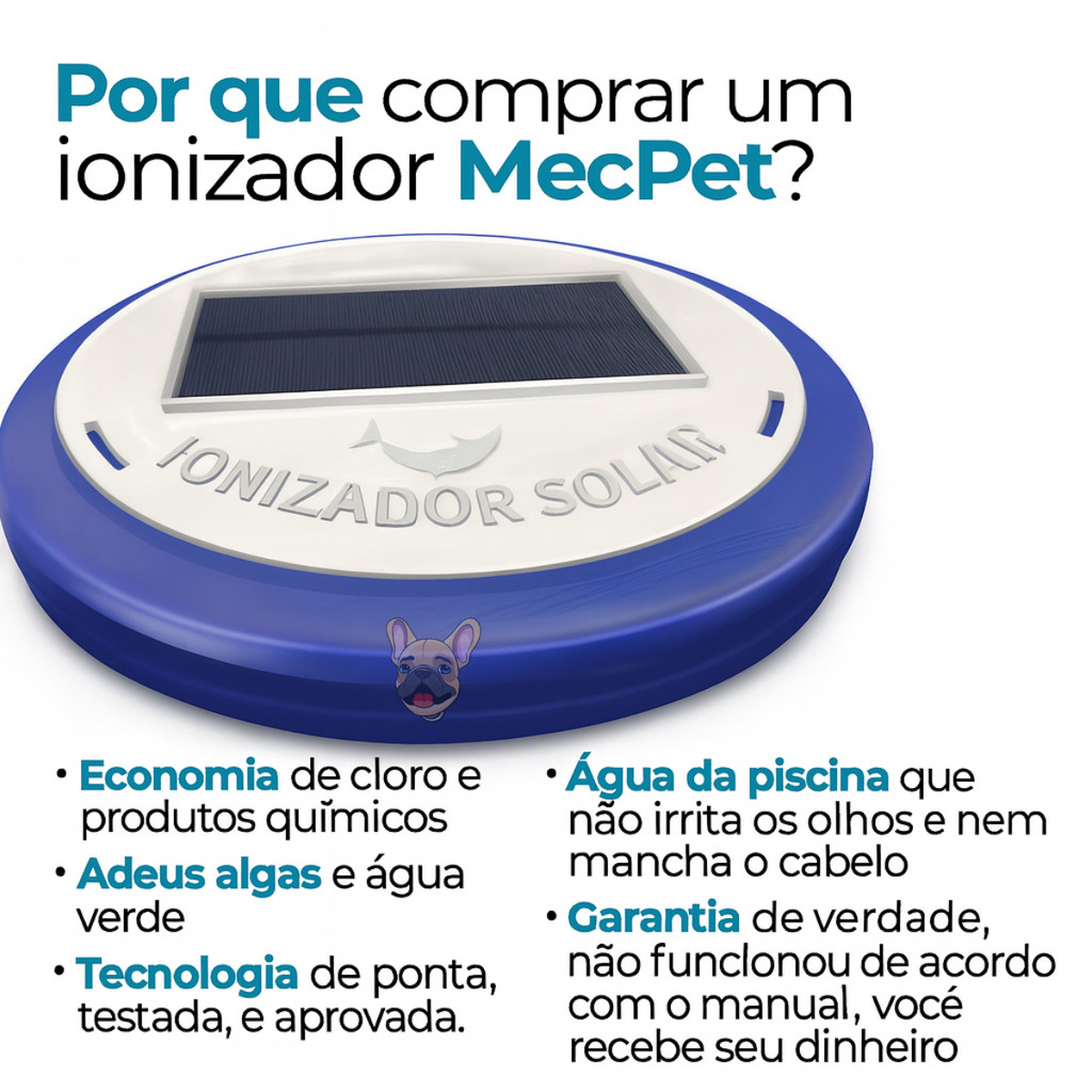 Ionizador Solar Para Piscina MecPet Até 100.000L Reduz Cloro • Antialgas • Energia Solar • Flutuante Ionizador Solar para Piscina — tratamento natural, econômico e eficiente. Mantenha sua piscina limpa, cristalina e equilibrada com o Ionizador Solar Mec Pet, um equipamento flutuante que utiliza energia solar e eletrodo de cobre para auxiliar no controle de algas e micro-organismos. Este ionizador solar piscina cobre antialgas é uma solução prática para quem busca reduzir cloro, reduzir químicos e economizar manutenção, sendo ideal para piscinas residenciais ou comerciais de até 100.000 litros. Equipado com tecnologia de ionização mineral, o aparelho atua como tratamento complementar de água de piscina, promovendo melhor qualidade, transparência e estabilidade. ________________________________________ Benefícios • Ajuda a reduzir cloro e algicidas • Auxilia no controle de algas (ação antialgas piscina) • Contribui para água cristalina e limpa • Sistema 100% solar — sem energia elétrica • Ionizador flutuante automático • Fácil uso — sem instalação • Baixa manutenção • Economia no tratamento químico ________________________________________ Como Funciona O painel solar ativa os eletrodos de cobre, liberando íons minerais que ajudam no controle biológico da água. Esse processo de ionização solar para piscinas auxilia em: • Controle de algas • Redução do uso de produtos químicos • Melhoria da transparência da água • Manutenção contínua ________________________________________ Especificações • Capacidade: até 100.000 litros • Tipo: Ionizador solar flutuante • Sistema: Ionização por cobre • Energia: Solar • Marca: MecPet • Instalação elétrica: Não necessária ________________________________________ Conteúdo da Embalagem • 1 Ionizador Solar Piscina • 2 Eletrodo Ø 6,35mmX90mm Rosca M3 • Manual ________________________________________ Perguntas Frequentes Funciona sem cloro? Não substitui totalmente. Atua como redutor de cloro para piscina 80%, sendo complemento ao tratamento químico. Precisa instalar? Não. Basta colocar o ionizador na água. Consome energia? Não. Equipamento energia solar piscina. Serve para qualquer piscina? Sim — fibra, vinil ou alvenaria até 100.000L. Precisa trocar peças? Os eletrodos possuem desgaste natural Funciona em dias nublados? Sim, com intensidade reduzida. Quanto tempo para resultado? Normalmente poucos dias, dependendo da condição da água. Precisa manutenção? Limpeza básica e troca de eletrodo quando necessário. Ajuda a economizar? Sim — reduz químicos e manutenção. Ionizador Solar Piscina 100mil L Reduz Cloro Ionizador Solar Piscina Antialgas 100000L Ionizador Solar Piscina Cobre Até 100mil L Ionizador Solar Piscina Flutuante 100000L Ionizador Solar Piscina Reduz Químicos 100mil L Ionizador Solar Piscina MecPet Até 100000L Ionizador Solar Para Piscina 100mil L Cobre Ionizador Solar Piscina Água Cristalina 100mil L