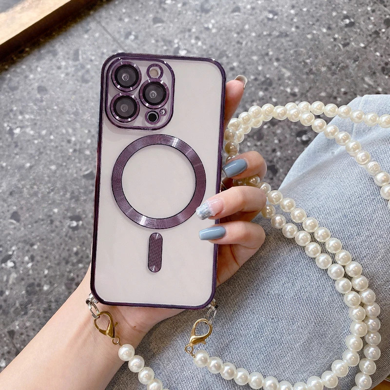 iPhone 15 16 14 13 12 11 Pro Max Plus Pearl Crossbody Lanyard Chapeamento Caso Capa Magnética De Carregamento Sem Fio