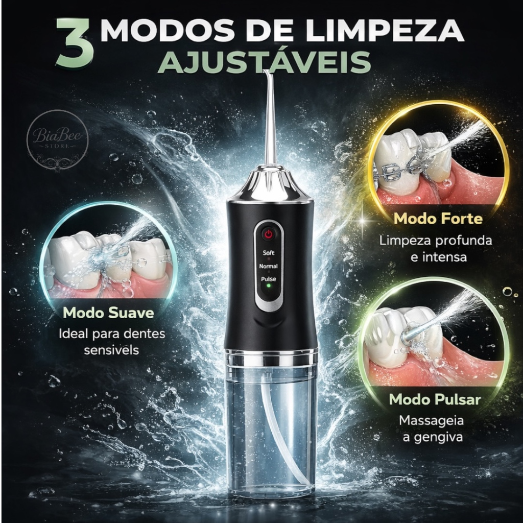 Irrigador Bucal Recarregável USB | Jato de Água para Dentes e Gengiva 🦷 Tenha uma rotina de higiene bucal mais prática e eficiente com um jato de água direcionado que auxilia na limpeza entre os dentes e na região da gengiva. Ideal para quem busca complementar a escovação diária e manter uma sensação de limpeza mais profunda. 💦 Benefícios do Produto * Jato de água direcionado para dentes e gengivas * Auxilia na remoção de resíduos entre os dentes * Ideal para quem usa aparelho * 3 modos de uso * Recarregável via USB * Portátil e fácil de transportar * Reservatório removível e fácil de abastecer 🎯 4 Ponteiras Inclusas • Limpeza diária • Ideal para aparelho • Cuidado com a gengiva • Higiene da língua Mais versatilidade para diferentes necessidades. 📐 Especificações Técnicas • Altura total (com ponteira): 28,3 cm • Largura aproximada: 5 cm • Recarregável via USB • Produto portátil • Reservatório removível 🎨 Cores Disponíveis Disponível nas cores: • Branco • Preto • Rosa • Verde ******As cores são enviadas conforme disponibilidade em estoque.***** *****Caso tenha preferência por alguma cor, entre em contato pelo chat após a compra. Faremos o possível para atender sua solicitação.***** Na ausência de contato, o produto será enviado em cor aleatória. *****Envio com Brinde Especial***** 🍯🐝Na Bia Bee Store você recebe um brinde exclusivo junto com seu pedido. 🚚 Produto novo | Pronta entrega | Envio rápido