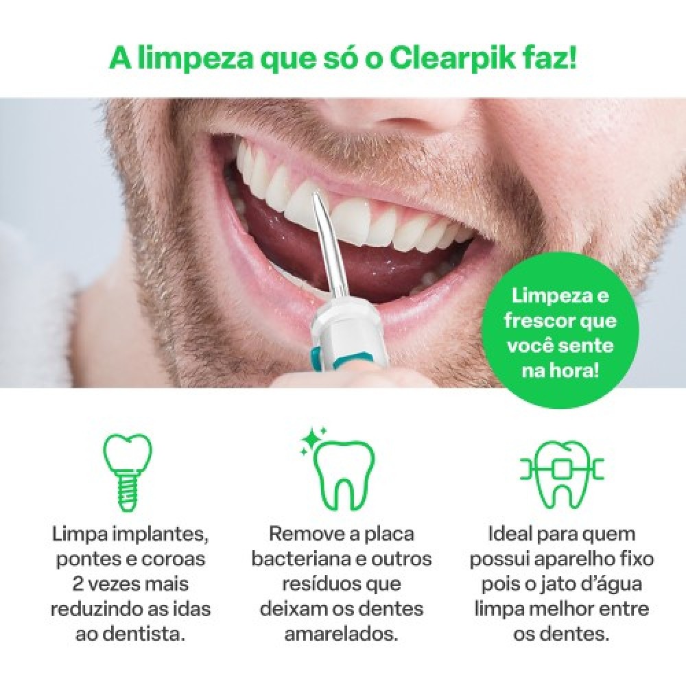 Com o Irrigador Oral Clearpik Family a higiene bucal de toda a família pode ser feita de maneira mais prática, fácil e muito mais eficaz que o fio dental. - Limpeza profunda em 360° que atinge todos os cantos da boca - Remove a placa bacteriana e outros resíduos que deixam os dentes amarelados - Limpa implantes, coroas e pontes de maneira 2x mais eficaz - Com 10 níveis de intensidade do jato d água direcionado O Clearpik Family é mais eficaz, enquanto o fio dental limpa somente entre os dentes, o irrigador oral atinge áreas de difícil acesso como o fundo e céu da boca, debaixo da língua e gengiva através da limpeza em 360° garantindo assim uma higiene bucal muito mais completa. Entre os dentes: Limpa profundamente as sujeiras localizadas entre os dentes Aparelhos e implantes: Remove placas, limpa implantes, coroas e aparelho ortodôntico Língua: Limpa a superfície da língua eliminando qualquer tipo de resíduo Gengiva: Massageia gentilmente as gengivas minimizando as bolsas periodontais Troque o bico e limpe a área que deseja Limpador de língua: que realiza a limpeza da superfície da língua Ortodôntico: para uso em aparelhos dentários, obturações e bandas Removedor de placas: para remoção de placas, limpeza de implantes e coroas Clássico: para limpeza entre dentes, gengivas e áreas de difícil acesso Periodontal: massageia a gengiva minimizando as bolsas periodontais Basta colocar água dentro do reservatório, escolher o nível de intensidade e iniciar a limpeza O uso do Irrigador Oral foi testado, aprovado e, hoje, é indicado pelos dentistas como um complemento realmente eficaz de higienização bucal diária, principalmente para quem faz uso do aparelho fixo e outras próteses dentárias. Ficha Técnica Marca: Multi Saúde Modelo: Irrigador Oral Multi Clearpik Family 600ml Bivolt - HC037 Cor: Branco e azul Voltagem: Bivolt Capacidade: 600ml Potência: 18W Força do jato: 125 PSI Pulsão por minuto: 1250-1700 Dimensões do produto (LxAxC): 21,5 x 11,4 x 29 cm Peso do produto: 680g Certificado INMETRO: UL-BR 20.1626 Conteúdo da Embalagem: 1 Irrigador oral portátil, 3 Bicos clássicos, 1 Bico ortodôntico 1 Bico limpador de língua, 1 Bico periodontal, 1 Bico removedor de placas 1 Manual de instruções. *Imagens meramente ilustrativas.