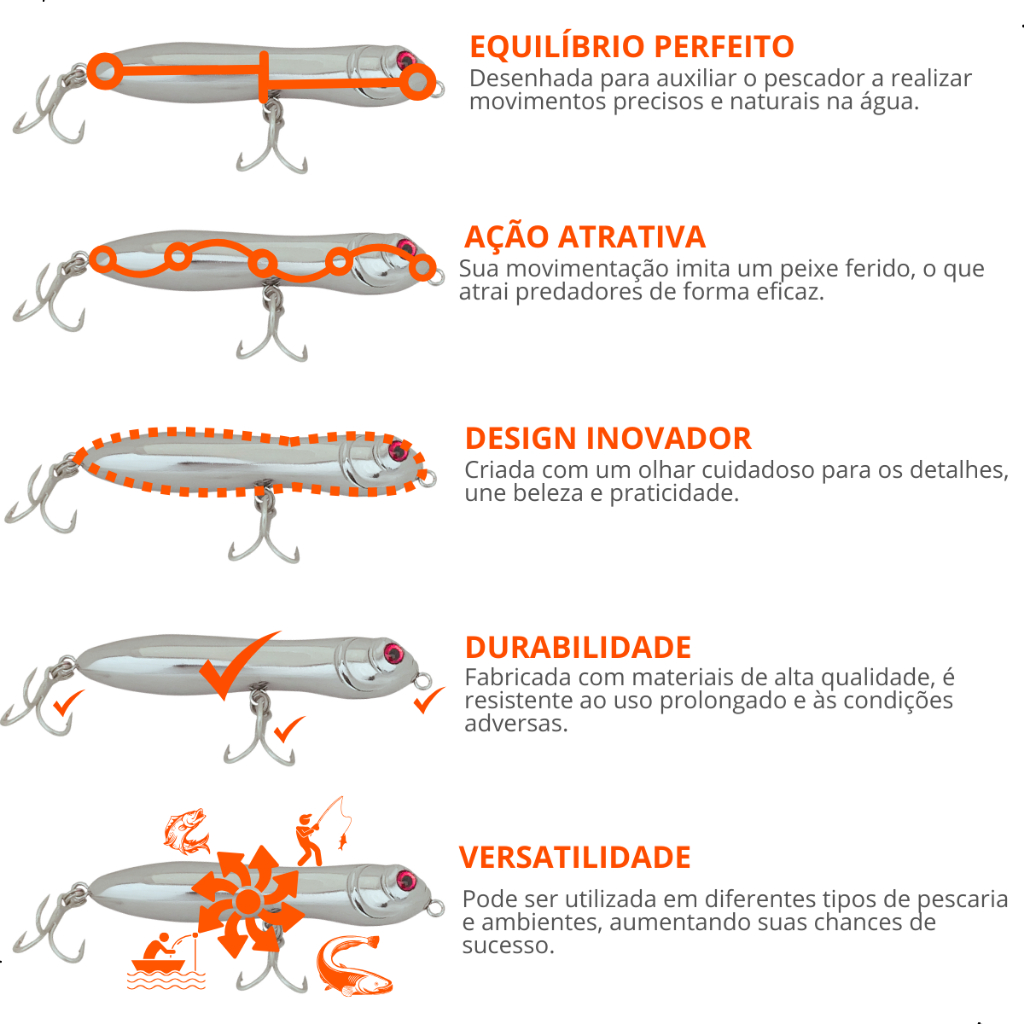Isca Zig Zarinha 90 cor 301 bala de prata Nelson Nakamura Isca artificial de superfície com ação em Z, mais conhecida como ação em Zig Zag na cor Cromada Bala de Prata. A isca Zig Zarinha 90 Bala de Prata é uma isca artificial do tipo stickbait, projetada para pesca de superfície. Sua característica principal é o nado em "Z", conhecido como "Zara Action", que imita o comportamento de um peixe ferido ou fugindo, algo que atrai a atenção de predadores aquáticos. Ela é especialmente eficaz em condições de pesca onde os peixes estão atacando na superfície ou em águas mais rasas. É muito usada para capturar espécies predadoras como tucunaré, traíra, robalo e outras. Além disso, sua cor 301 (bala de prata) reflete a luz, tornando-a mais atraente em dias ensolarados ou águas claras. Esse nome "bala de prata" foi escolhido porque representa uma solução única e eficiente para a captura de peixes predadores de forma eficaz. Especificações: Fabricante: Nelson Nakamura Modelo: Zig Zarinha 90 Tamanho: 9 cm Peso: 12 g Ação: Superfície Cor: 301 Cromada Bala de Prata