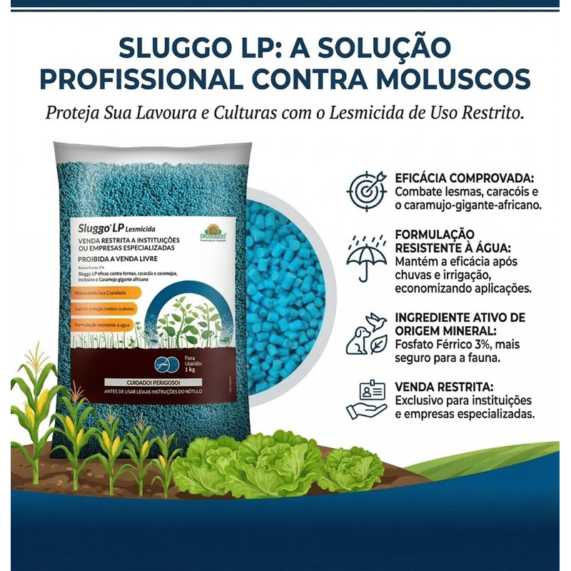 SLUGGO – Isca granulada para eliminação de lesmas e caracóis SLUGGO é composto por iscas atrativas em grânulos, altamente eficazes no controle de lesmas e caracóis. Após a ingestão, os moluscos interrompem imediatamente a alimentação, recolhendo-se aos seus esconderijos, onde morrem entre 2 a 6 dias depois. O efeito fisiológico da isca garante proteção imediata às plantas. Ingrediente ativo: Fosfato de Ferro (FePO₄) – concentração de 3% O FePO₄ é um composto natural presente no solo e, ao se decompor, transforma-se em fertilizante para as plantas. Aplicações ideais SLUGGO oferece proteção para: Gramados Jardins Estufas Plantas ornamentais Hortas Frutíferas Grãos Plantações em geral Modo de aplicação A isca deve ser espalhada diretamente sobre o solo ou gramado, ao redor das plantas a serem protegidas. Os grânulos não consumidos se decompõem, atuando como adubo natural. A tecnologia dos pellets garante alta resistência à chuva. Mesmo após absorver e perder água várias vezes, os pellets mantêm sua forma e eficácia. Vantagens do produto Não tóxico para seres humanos e animais de estimação Preserva pássaros, minhocas e abelhas Alta resistência à umidade Não contamina o solo nem a água da chuva Produto importado da Alemanha Certificado pela ANVISA