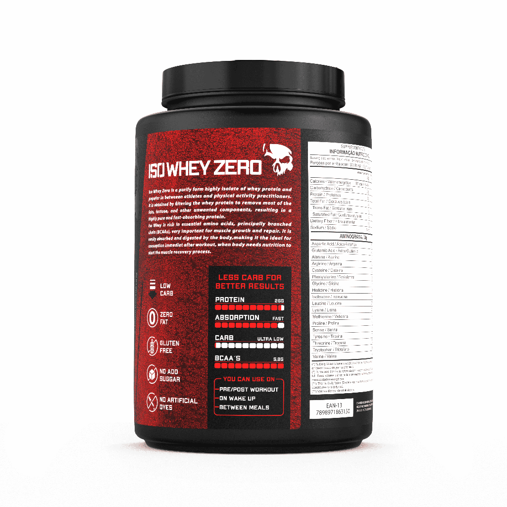 (Descrição Iso Whey Zero Low Carb) ● A Iso Whey Zero Low Carb é a escolha definitiva para alcançar um corpo saudável e definido! Com sua fórmula de proteína isolada do soro de leite (WPI), cada dose proporciona 26g de proteína, 0,8g de carboidratos e 5.8g de BCAA. A proteína isolada passa por um processo avançado de filtragem para concentrar suas propriedades benéficas, tornando-a uma opção ideal para atletas e entusiastas de atividades físicas que buscam o máximo em qualidade e performance. Com a Iso Whey Zero, você terá uma proteína altamente pura, de rápida absorção e baixo teor de gordura e carboidratos, ajudando você a alcançar seus objetivos de maneira eficiente e saudável. Além disso, a Iso Whey Zero é livre de glúten. Experimente o melhor, entre para o Team Dark Lab. ● BENEFÍCIOS: • Ajuda no ganho de massa magra; • Auxilia na recuperação; • Baixo teor de gordura e carboidratos; • Rápida absorção; ● QUALIDADE DARK LAB: • Matéria-prima de alta qualidade; • Alta quantidade de aminoácidos; • High Protein; • Gluten Free. ● MODO DE PREPARO: • Dissolver 30g (1 dosador) do produto em 150ml de água, leite ou bebida de sua preferência. ● SUGESTÃO DE USO: •Consumir uma porção ao dia, ou conforme orientação profissional. ● INGREDIENTES: • Morango/Strawberry Proteína Isolada do soro do leite (WPC), aroma idêntico ao natural de morango, espessante goma xantana, corante vermelho bordeaux, edulcorante sucralose e antiumectante dióxido de silício. Colorido Artificialmente. NÃO CONTÉM GLÚTEN. CONTÉM LACTOSE. • Chocolate Proteína Isolada do soro do leite (WPC), cacau em pó, aroma idêntico ao natural de chocolate, espessante goma xantana, edulcorante sucralose e antiumectante dióxido de silício. NÃO CONTÉM GLÚTEN. CONTÉM LACTOSE. • Baunilha/Vanilla Proteína Isolada do soro do Leite (WPC), aroma idêntico ao natural de baunilha, espessante goma xantana, edulcorante sucralose e antiumectante dióxido de silício. NÃO CONTÉM GLÚTEN. CONTÉM LACTOSE. ● CONSERVAÇÃO E ADVERTÊNCIAS: •Este produto não é um medicamento. Mantenha fora do alcance de crianças. Não exceder a recomendação diária de consumo indicada na embalagem. Produto indicado para adultos. Conservar este produto fechado, ao abrigo da luz, calor e umidade. Após aberto, consumir preferencialmente em 30 dias. ● ALÉRGICOS: •CONTÉM DERIVADOS DO LEITE. PODE CONTER OVO E SOJA.
