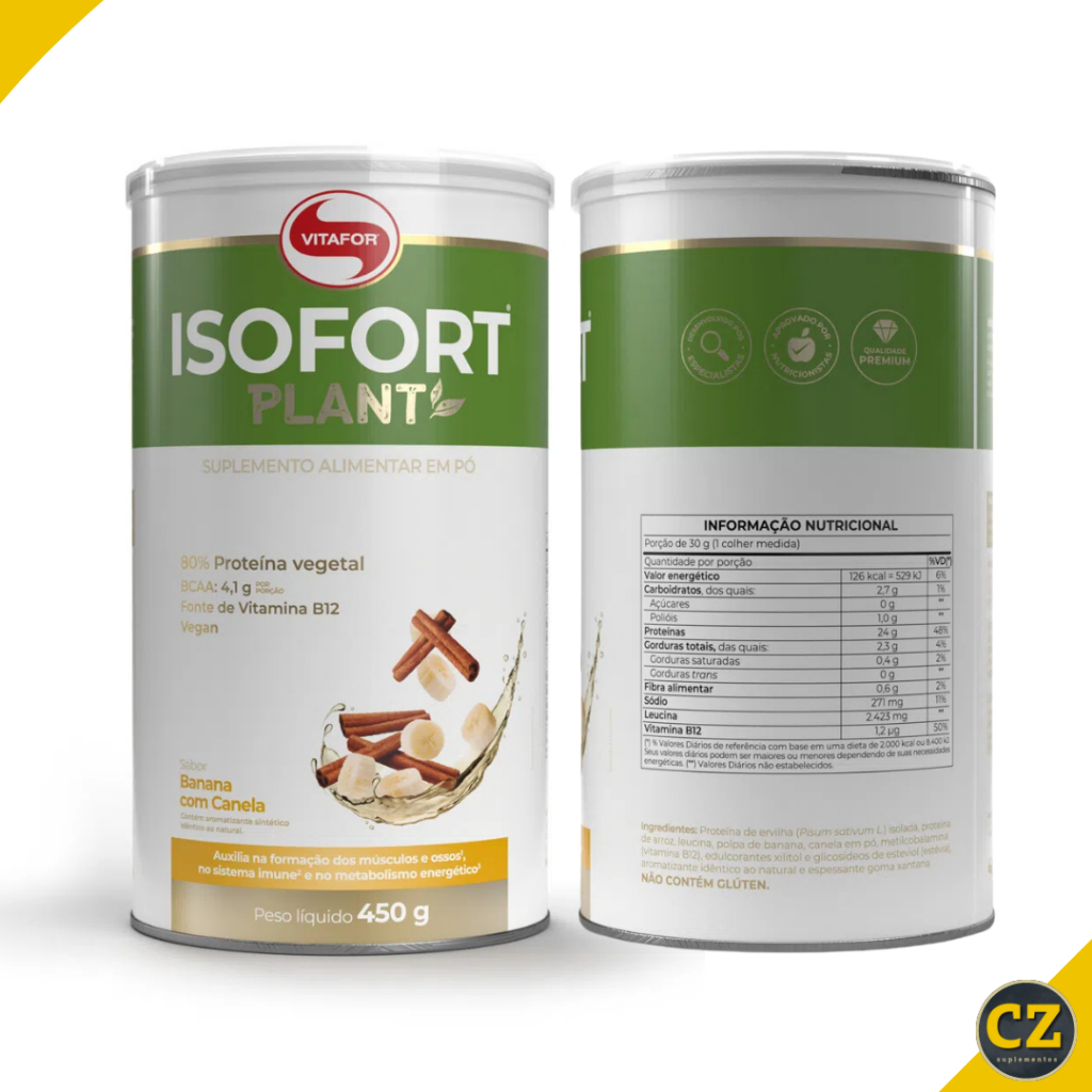 ISOFORT PLANT é um suplemento alimentar plant-based composto por blend de proteínas vegetais: proteína isolada de ervilha e proteína de arroz, leucina e vitamina B12, com zero adição de açúcares. Possui alta concentração de proteínas, nutriente esse que auxilia na formação dos músculos e ossos, além de ser fonte de vitamina B12, nutriente esse que auxilia no funcionamento do sistema imune, no metabolismo energético, dos carboidratos, das proteínas e das gorduras. Benefícios • Fonte de proteínas, nutriente esse que auxilia na formação dos músculos e ossos; • Fonte de vitamina B12, nutriente esse que auxilia no funcionamento do sistema imune2, no metabolismo energético3, dos carboidratos, das proteínas e das gorduras; Diferenciais • Plant-based; • Blend de proteínas vegetais: proteína isolada de ervilha e proteína de arroz; • 80% de concentração proteica (24 g) por porção; • Com adição de l-leucina (2423 mg) por porção; • 4,1 g de BCAA por porção; • Com adição de vitamina B12 de origem vegetal; RECOMENDAÇÃO DE USO Dissolva 30g (uma colher medida) em aproximadamente 300ml de água gelada ou suco de sua preferência. Agite bem. Beba antes das refeições ou antes e depois das atividades físicas Ingredientes Banana com canela Proteína de ervilha (Pisum sativum L.) isolada, proteína de arroz, leucina, polpa de banana, canela em pó, metilcobalamina (vitamina B12), edulcorantes xilitol e glicosídeos de esteviol (estévia), aromatizante idêntico ao natural e espessante goma xantana. NÃO CONTÉM GLÚTEN. Ingredientes Cacau Proteína de ervilha (Pisum sativum L.) isolada, proteína de arroz, cacau em pó, leucina, metilcobalamina (vitamina B12), edulcorantes xilitol e glicosídeos de esteviol (estévia) e espessante goma xantana. NÃO CONTÉM GLÚTEN.