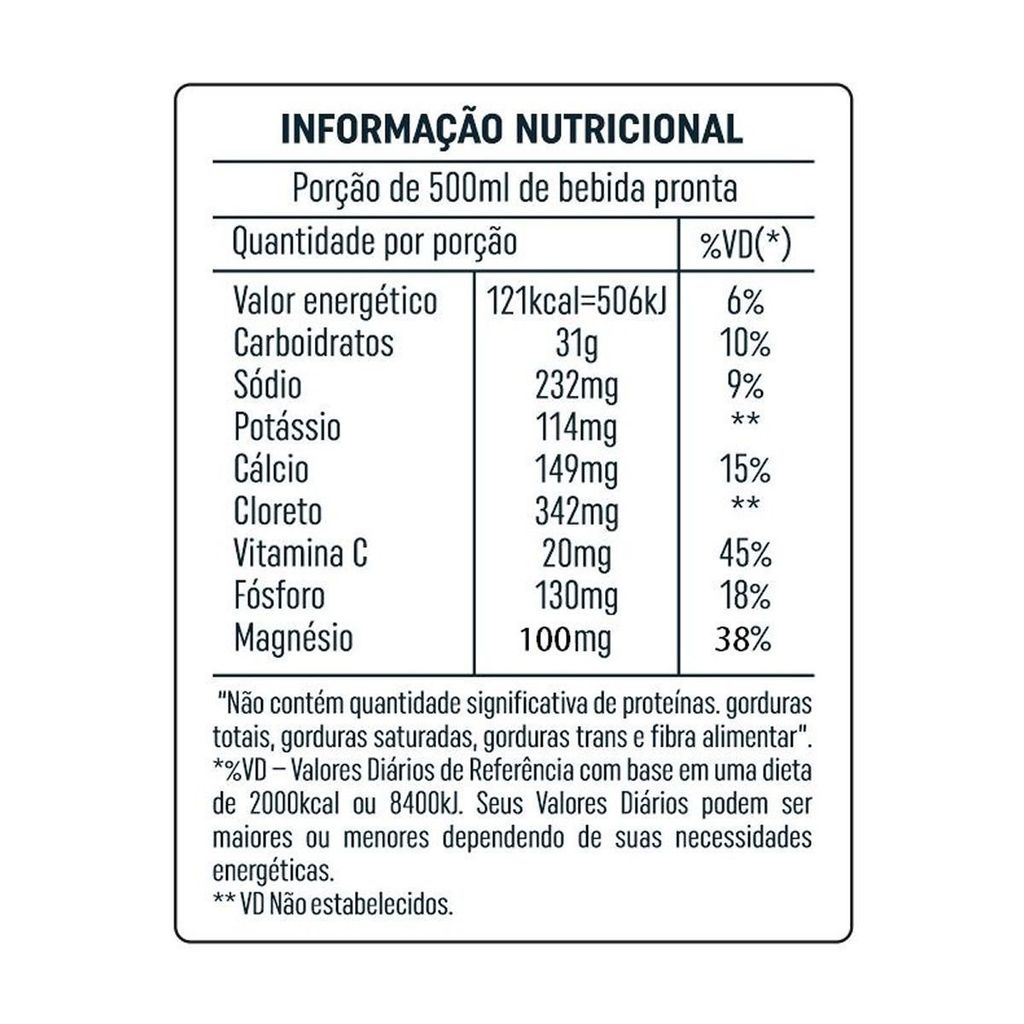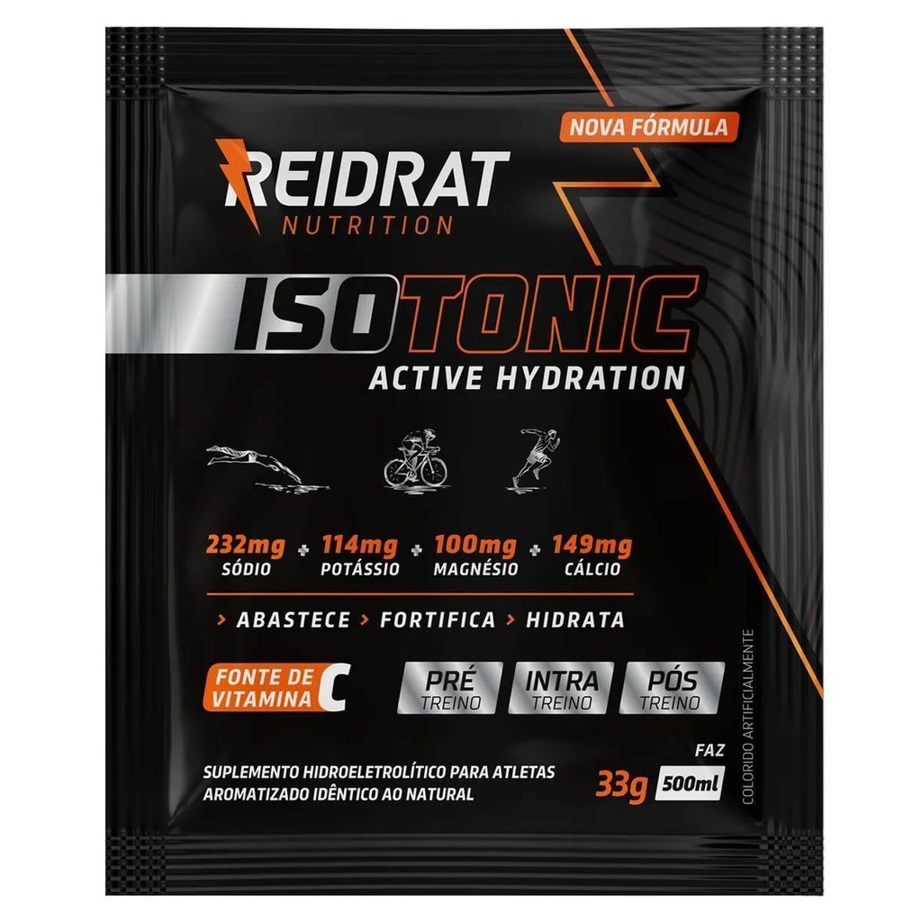 O Suplemento Hidroeletrolítico ISOTÔNIC em Pó é um produto Isotônico destinado à reposição hídrica de sais minerais e carboidratos. Após diluído em água e consumido, este produto cria um meio isotônico que facilita a hidratação de quem o consome. O Isotônico é caracterizado principalmente por conter a mesma osmolalidade do Plasma sanguíneo, o que significa que a reposição de sais minerais, carboidratos e água são realizados instantaneamente. Como Tomar Dissolver 1 Sachê (33g )em 500ml de água filtrada fria ou gelada. Misturar bem até dissolver por completo. Ingredientes Sacarose, Frutose, Glicose, Ácido Cítrico (Acidulante), Fosfato Tricálcico, Citrato de Sódio (Regulador de Acidez), Cloreto de Sódio, Fosfato de Potássio Monobásico, Acido Ascórbico (Vitamina C), Cloreto de Potássio, Bisglicinato de Magnésio e Aromatizante. NÃO CONTÉM GLÚTEN. DIABÉTICOS: CONTÉM FRUTOSE E GLICOSE. ...